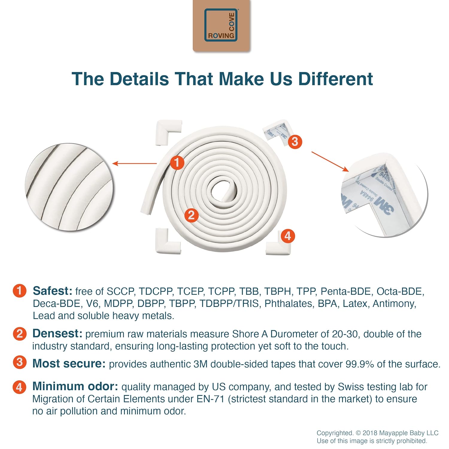 - CLEAN SAFETY: Roving Cove uses safe and pure raw material and was the first brand to make foam safety bumpers without the use of toxic flame-retardant chemicals (SCCPs). Our edge corner guards contain no BPA, no phthalates, no heavy metals, no latex, no SCCPs. Inherently flame-resistant; passed flammability tests under US regulations.