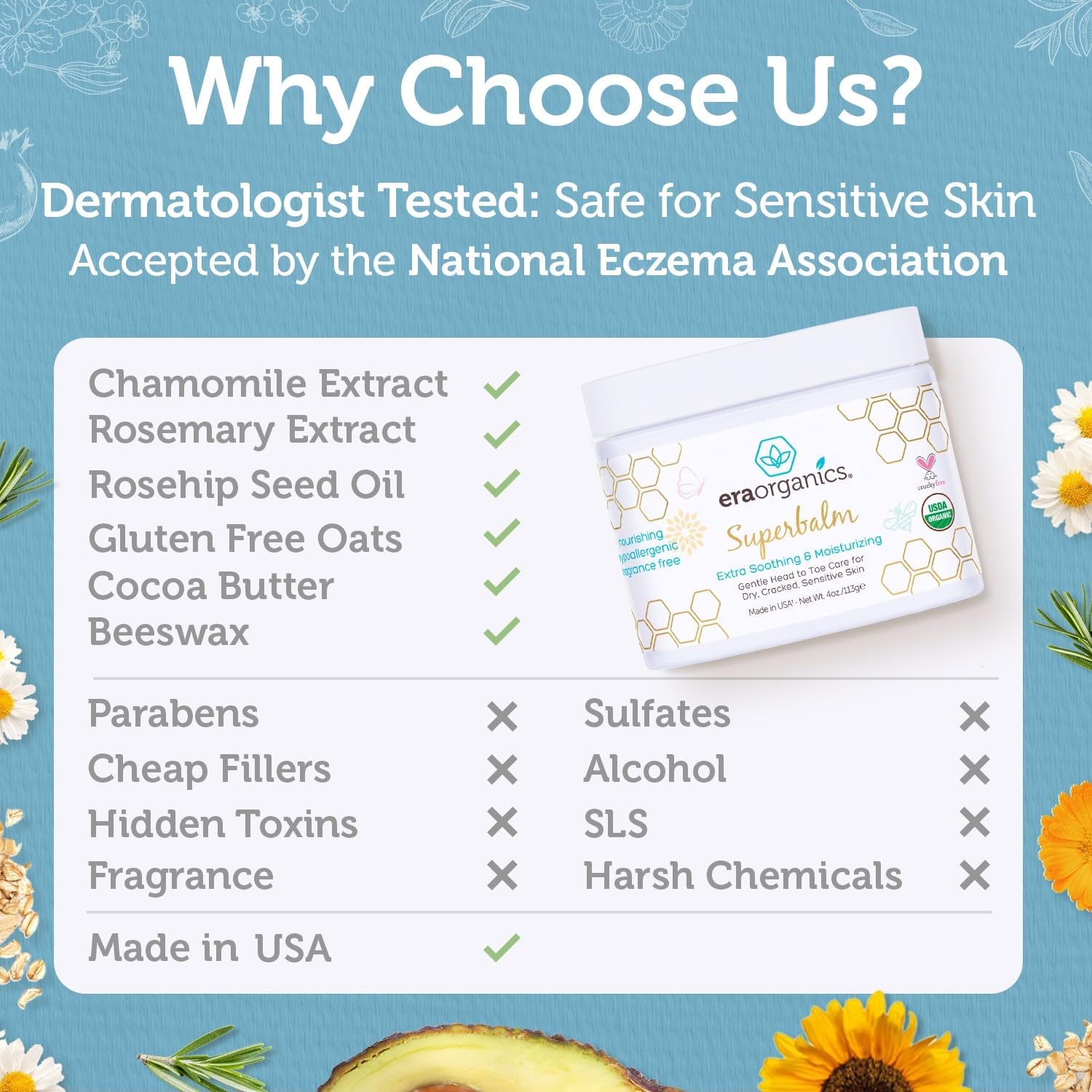 - All-Natural Eczema Balm as Safe as it is Effective: Era Organics is mother owned, family operated. Superbalm is proudly made in the USA, sustainably sourced and ethically harvested. Zero perfumes, chemicals, parabens, dyes or useless fillers.