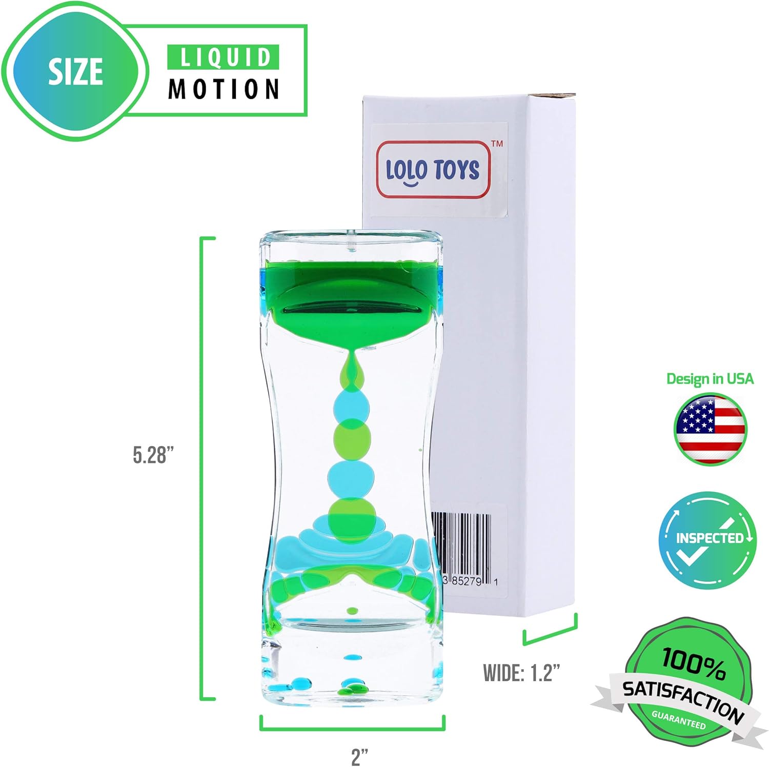 - Our Bundle Includes 1 Liquid Motion Bubbler and 1 Stretchy Toy – Lolo Toys 2-piece Fidget Set includes 1 liquid timer in Green as well as 1 matching strechy string toys in Green; Each water bubbler measures 5.7 inches long and 2.2 inches wide while our stretchy toys measure 11.2 inches long; Our figit toys for school, office or home are manufactured with high quality, safe and durable materials