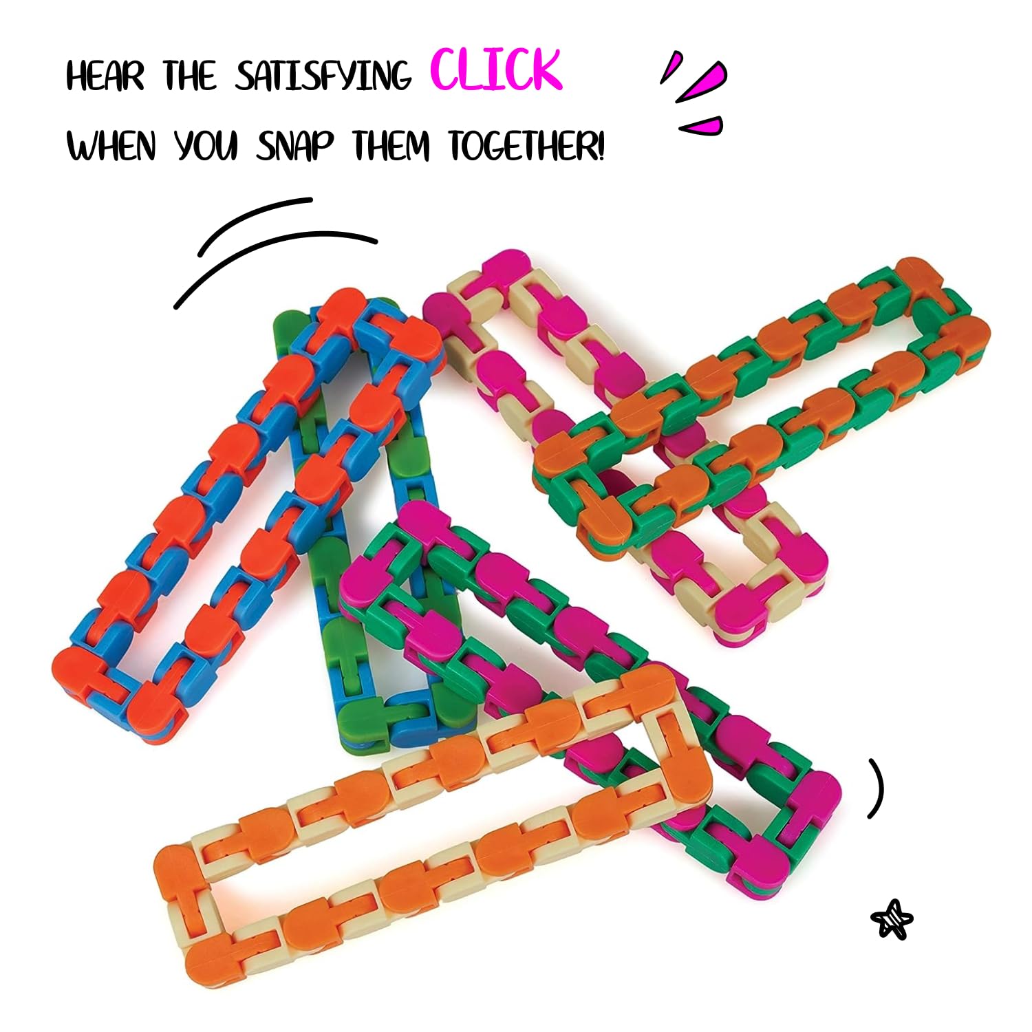 - SNAP, CLICK, CREATE: Each of the 24 links on the Snap & Click Toy pivots and locks into 5 positions, allowing you to build the chain in countless ways. They emit a delightful CLICK sound as you snap.