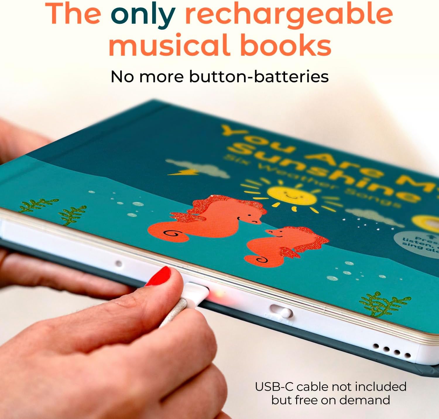 - USB-C Rechargeable: Our toddler books ages 1-3, like this USB-C rechargeable Wheels on the Bus, offer endless fun without the battery hassle. They are perfect musical toys for toddlers 1-3 and great interactive books for 1 year olds!