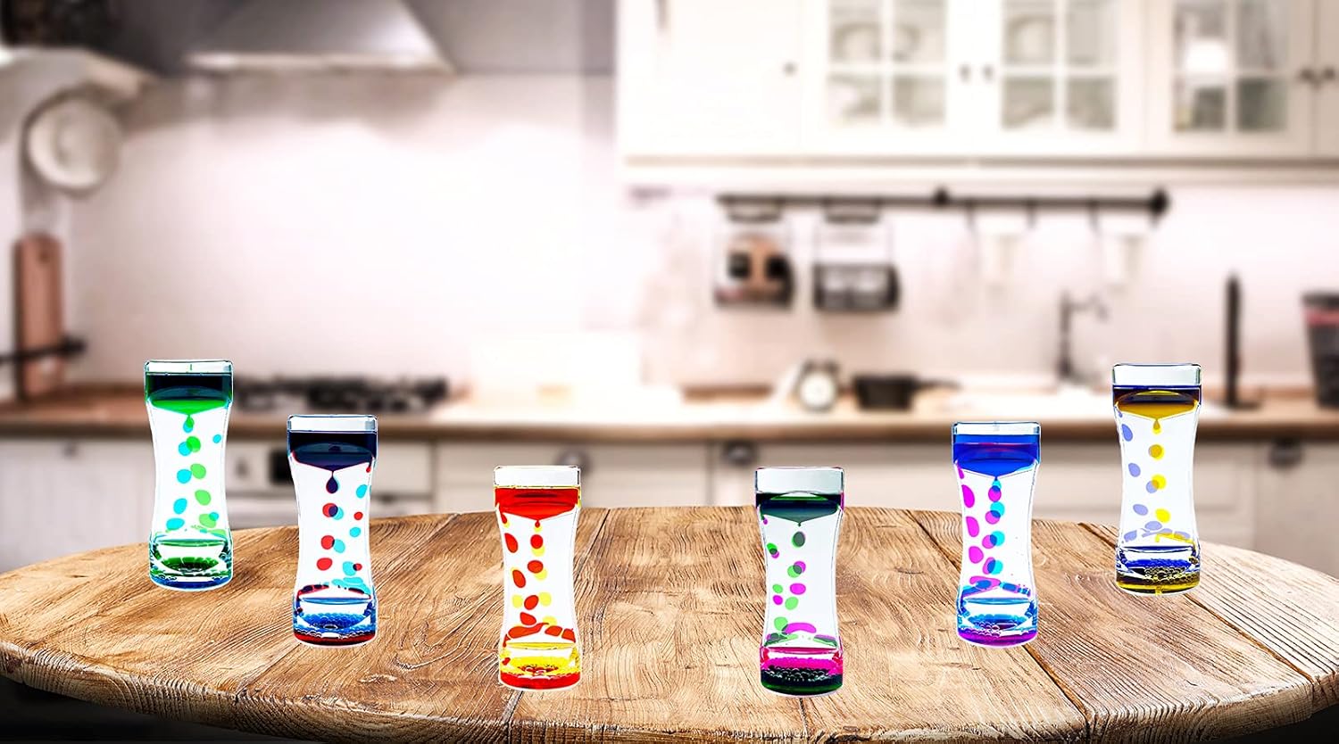 - 1.Great and Charming: Water Oil Liquid motion bubbler timer using sealing acrylic material, safety oil drop and appropriate amount of bubbles to create the perfect picture, give you unexpected surprise. Liquid timer Never runs out of energy. Just flip over and start again.- 6 different mixed colors Liquid timers.