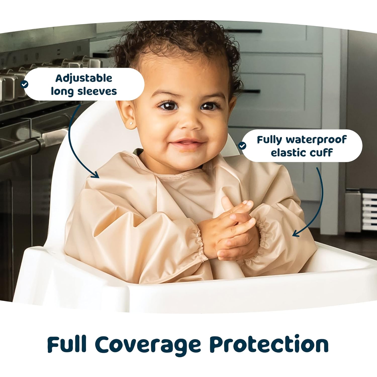 Tiny Twinkle Mess Proof Baby Bibs, 2pk Waterproof Smock Baby Bibs for Eating, Machine Washable Long Sleeve Bibs, Baby Led Weaning, Toddler Bibs, BLW Supplies (Sand Cinnamon, Large 2-4 Years)
