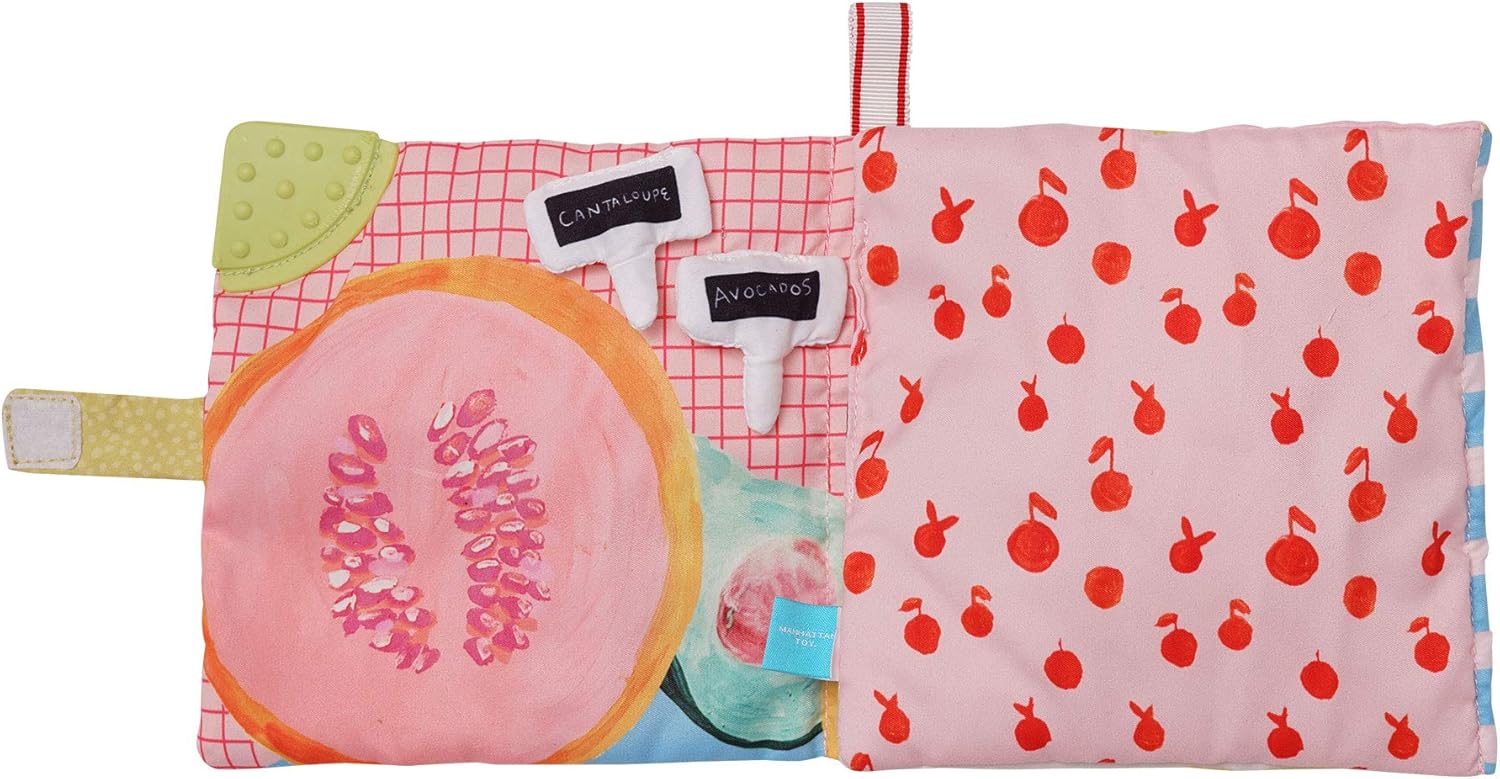 - TUMMY TIME BABY TOY: Baby's first book features colorful graphics and textured fabrics inspired by a fruit and vegetable stand. Other tummy time activities include playing with the fabric crinkle basket, textured teether corner and baby-safe mirror, where little one will explore self-discovery.