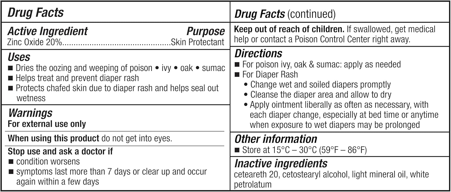 - ZINC OXIDE: Active Ingredient Zinc Oxide 20% provides relief and treatment of diaper rash, chafed skin, and dries the oozing and weeping of poison ivy, oak and sumac.