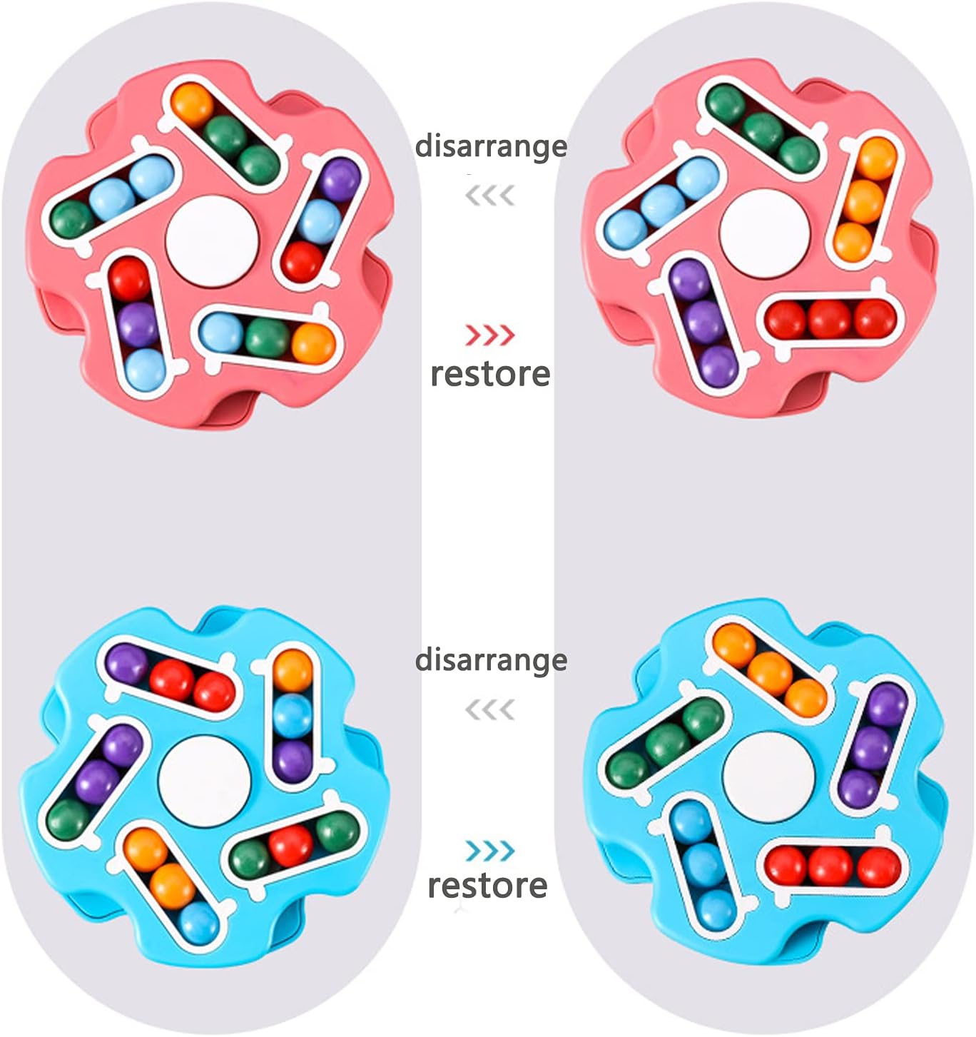 - 【Double-Sided Playable】 There are 5 slots on the front and rear sides, and a total of 5 different colors of beads. Rotate the double-sided turntable to move the beads of different colors to match the same color.