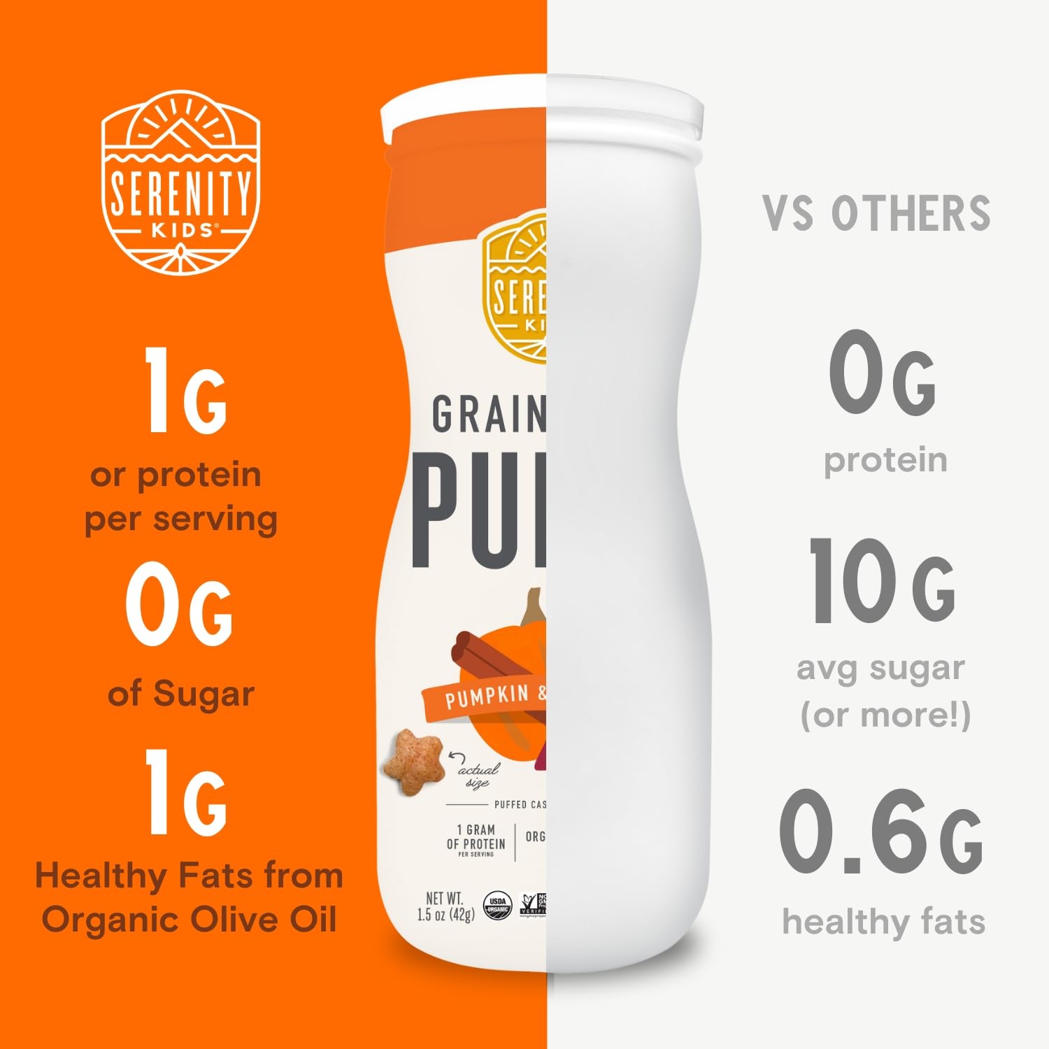 - PERFECT SIZE AND FLAVOR: Each grain free puffs baby pack comes with six 1.5-ounce canisters of pumpkin and cinnamon puffs, designed to be easy for little hands to hold and enjoy