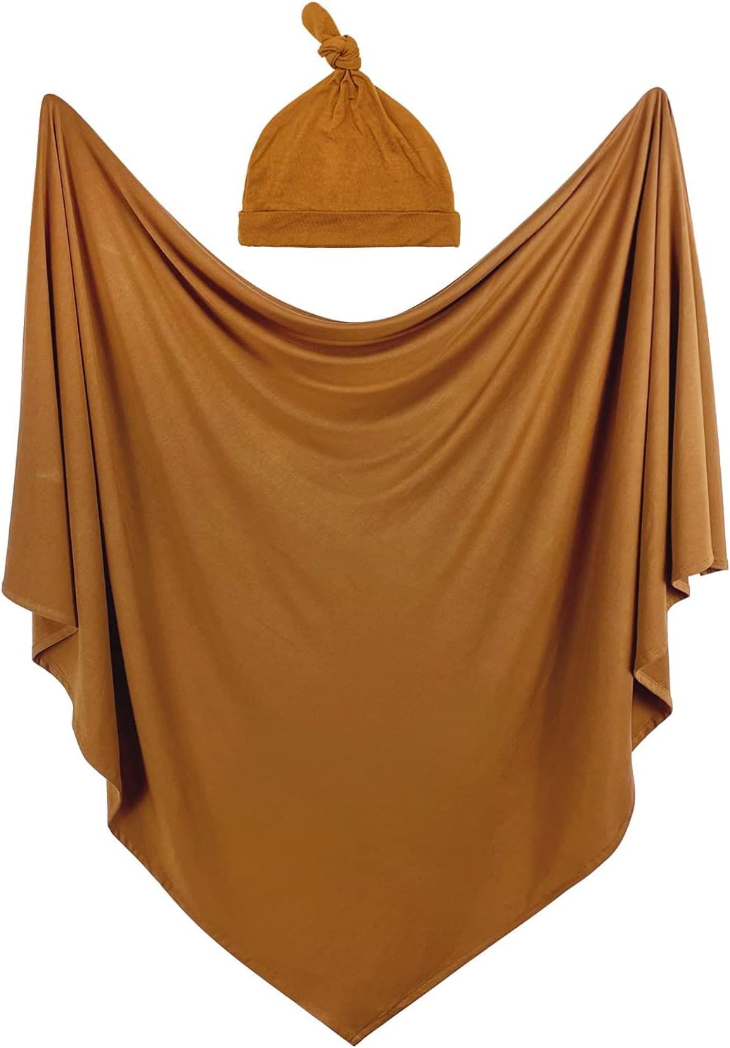 iEvolve Cotton Knitted Baby Swaddle Blanket with Hat Headband Set Newborn Swaddle Wrap Receiving Blankets for Baby Girl Boy 45" x 45"(Ginger)
