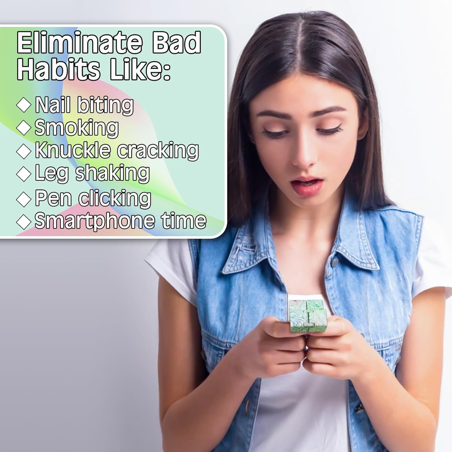 - Fidget Infinitycube was Created - For use as an anti-stress toy to combat anxiety, an autism sensory toy, or as ADHD toys to encourage attention.Helps you confidently crush those nagging bad habits that weigh you down.Helps your kids off the screen.It fits easily in the palm of your hand for A-handed operation ability and portable fidgeting relief.