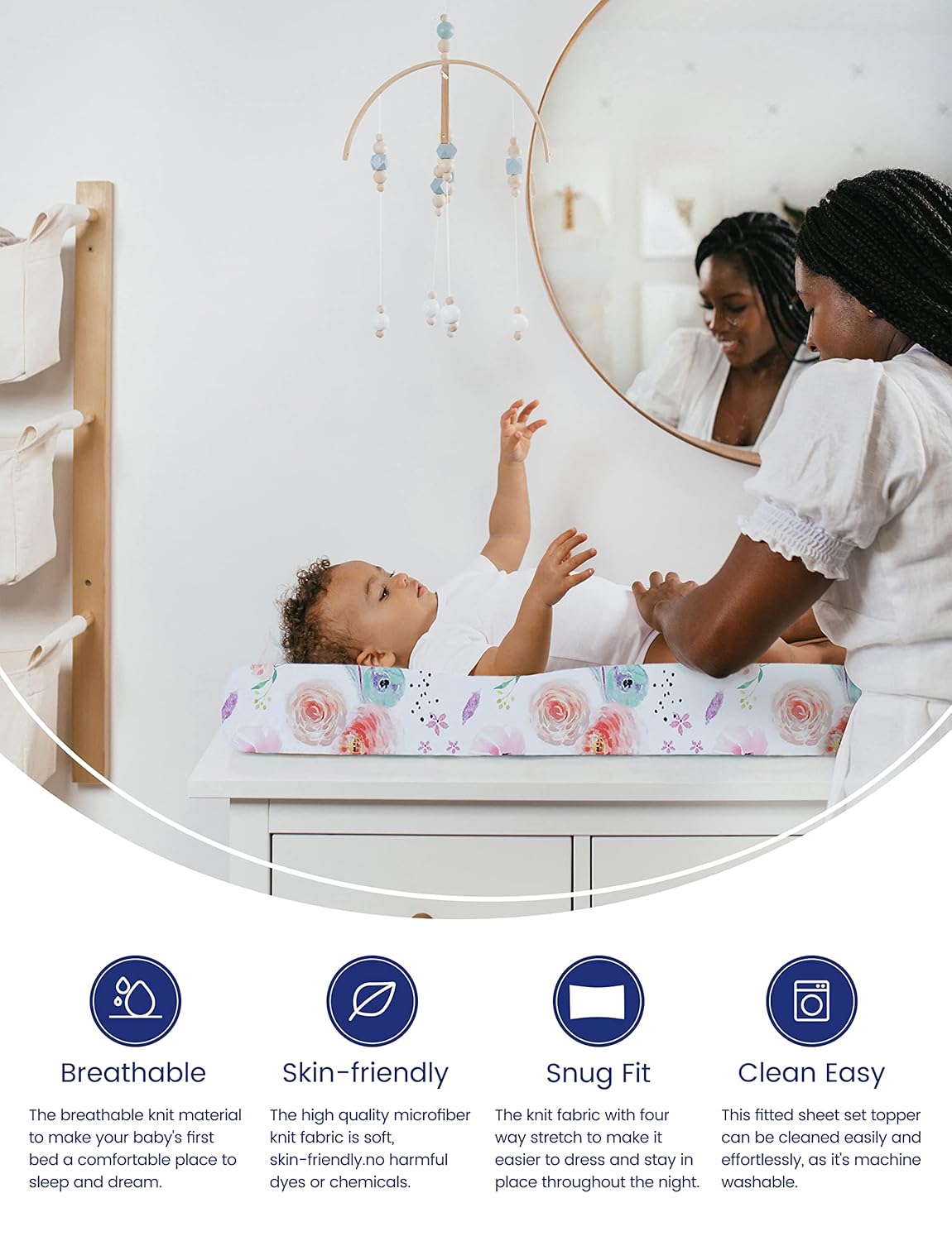 TotAha Premium Stretchy Changing Pad Covers (2-Pack)-Hypoallergenic, Silky Comfort, Buttery Soft, Calming Effect, All-Season Jersey-Knit 32'' X 16'' X 5'' Deep Pocket (Colorful Flora & Blue Flowers)