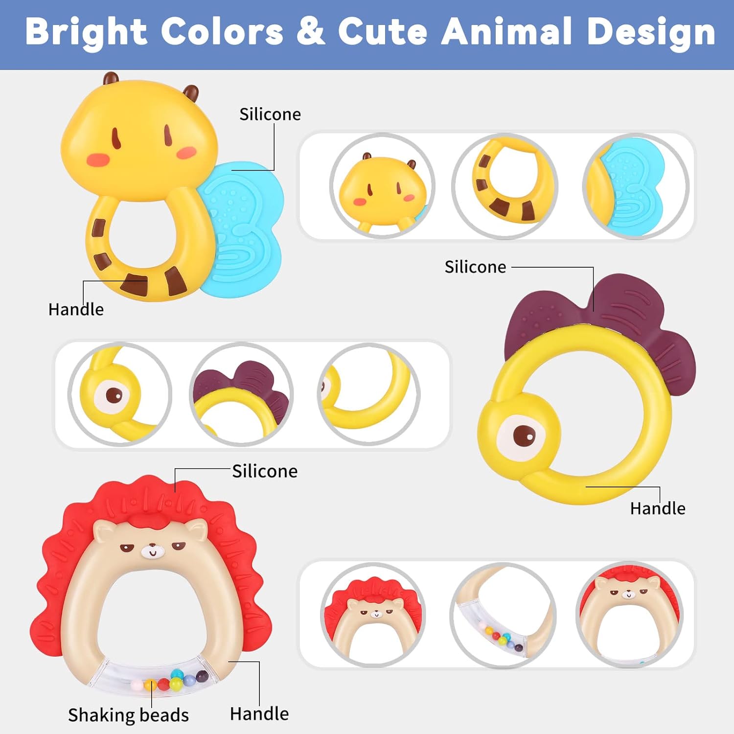 - Safe and Durable Materials: The baby toys 6 to 12 months chewing and teething toys are made of food-grade silicone&BPA-free plastic. Passed US Baby CPC Toy Test. Polished smooth edges, Burr-free and strong enough to withstand chewing and large enough to avoid choking hazards. Our baby teether toys are safe for the baby to play, touch, chew and gnaw. They are perfect teething toys for infants 6-12 months.