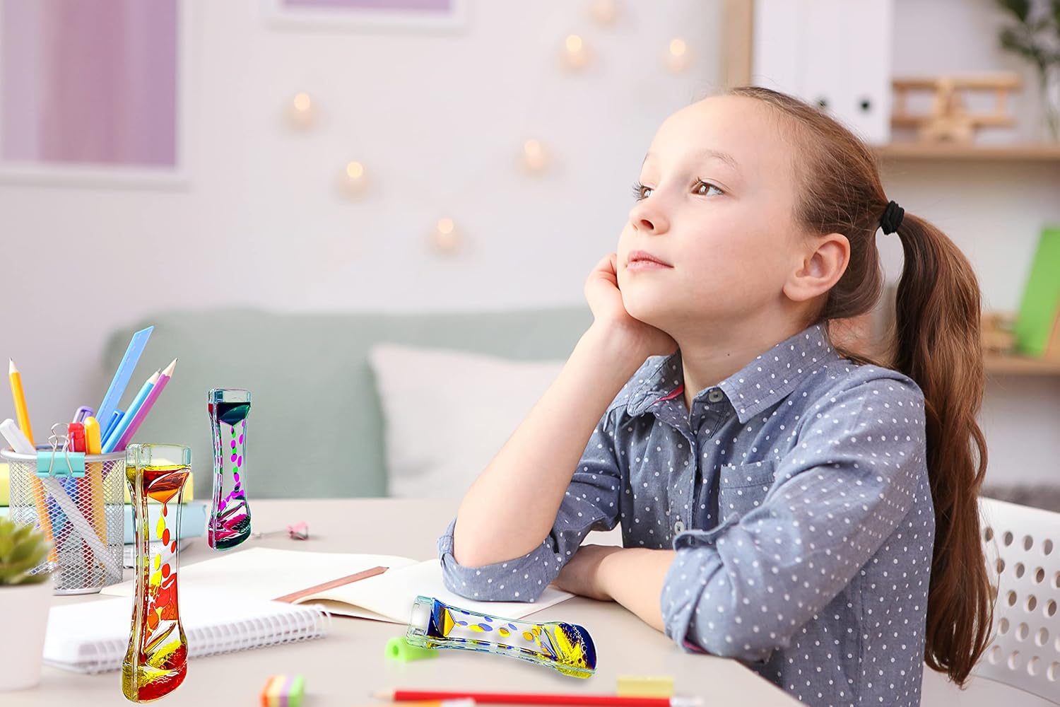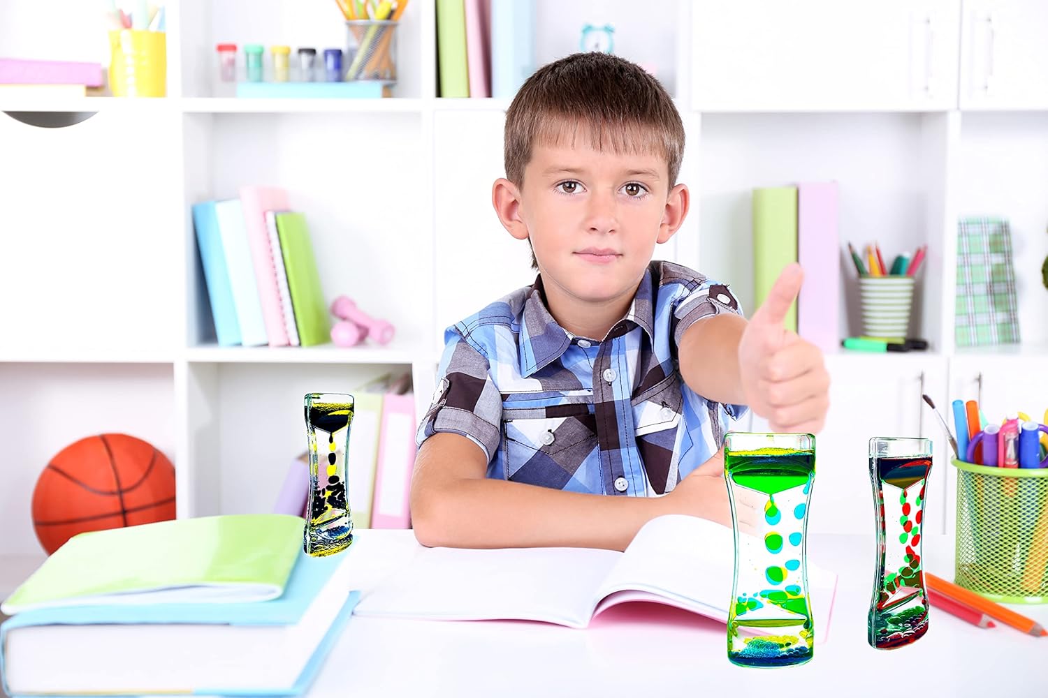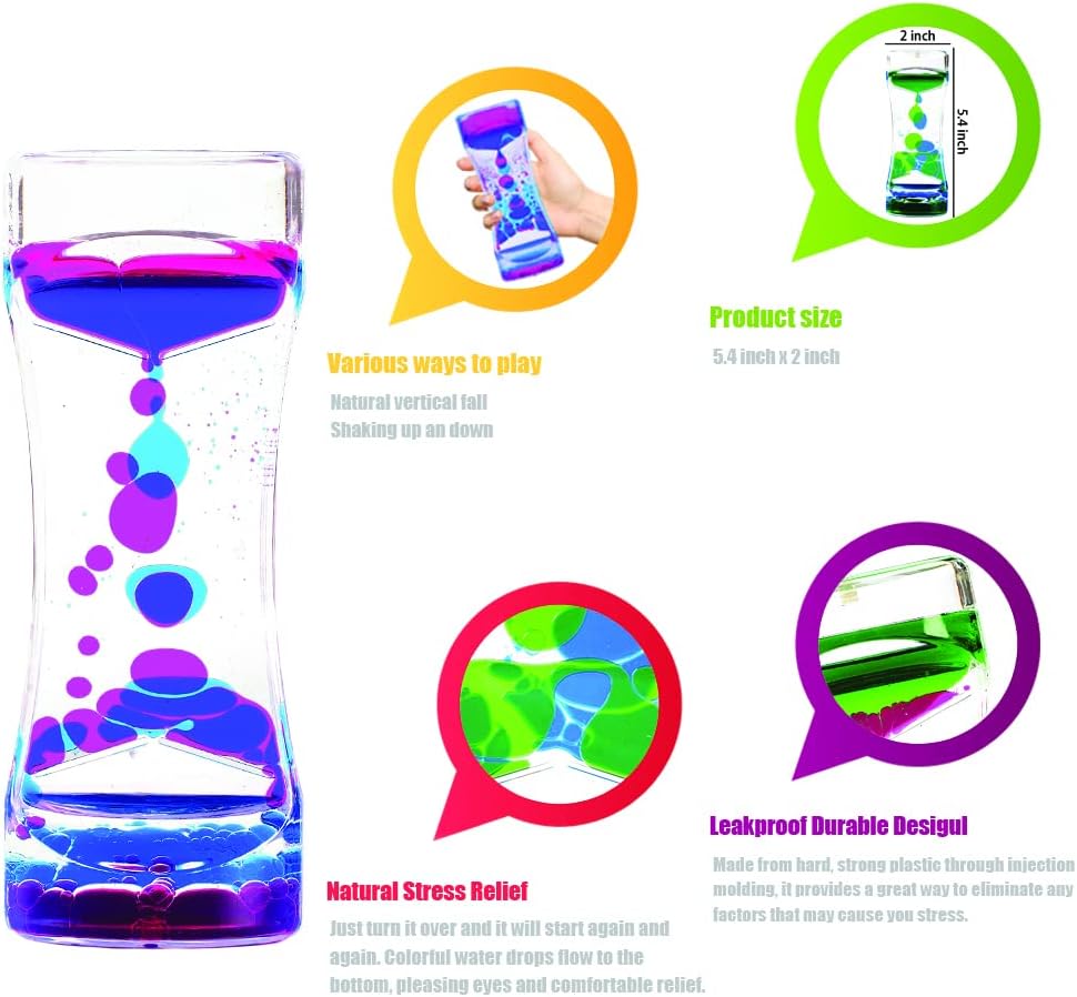 - Perfect Liquid Bubbler Timer Toys- A gentle fidget toy that pleases the eye and eases for comfort. It relaxes with its colorful droplets flowing to the bottom. Sure, our liquid bubblers can be gifted to your kids for hours and hours of fun, but they can also be used by adults to manage their stress or even as decorative pieces to give your office desk an awesome look