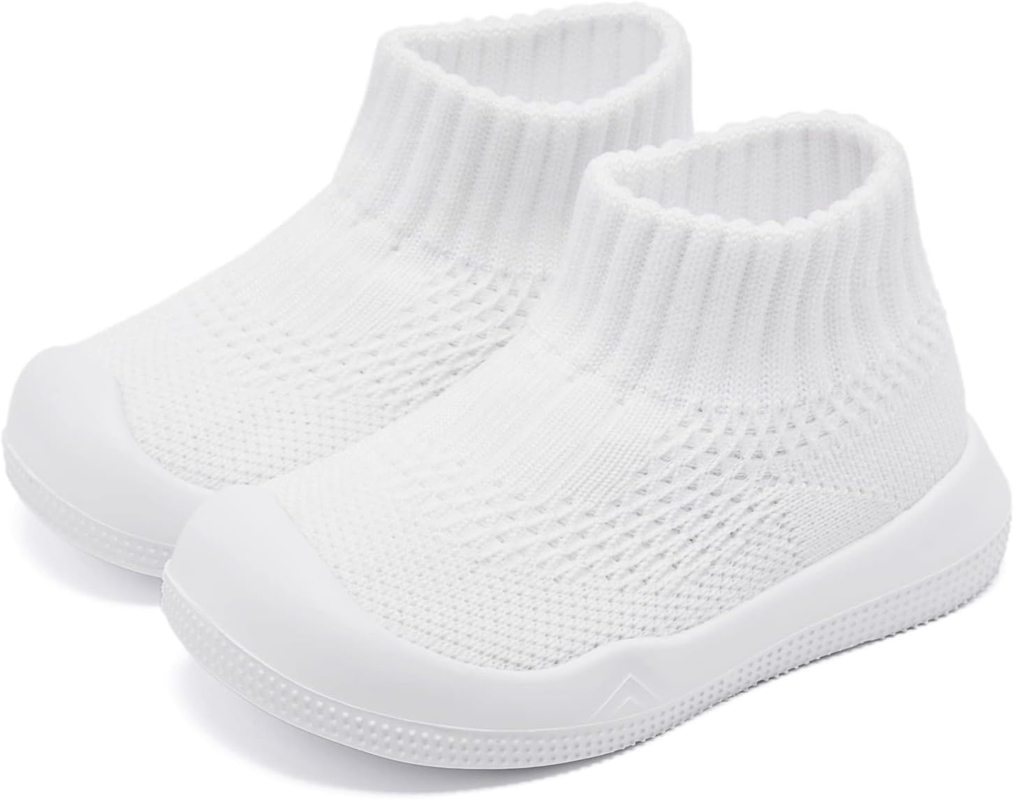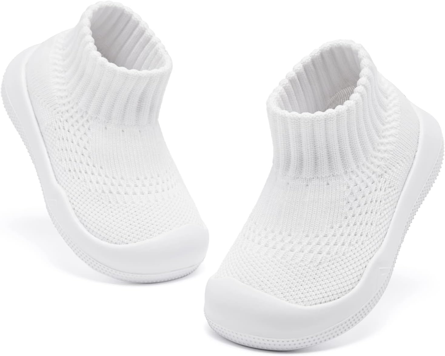 • Easy Put On:Baby walking shoes The one-piece design with stretchy knit collar only takes seconds to for you to slip them on, so babies can jump right into playtime. Toddler slip on shoes let them play in comfort while enjoying their time.