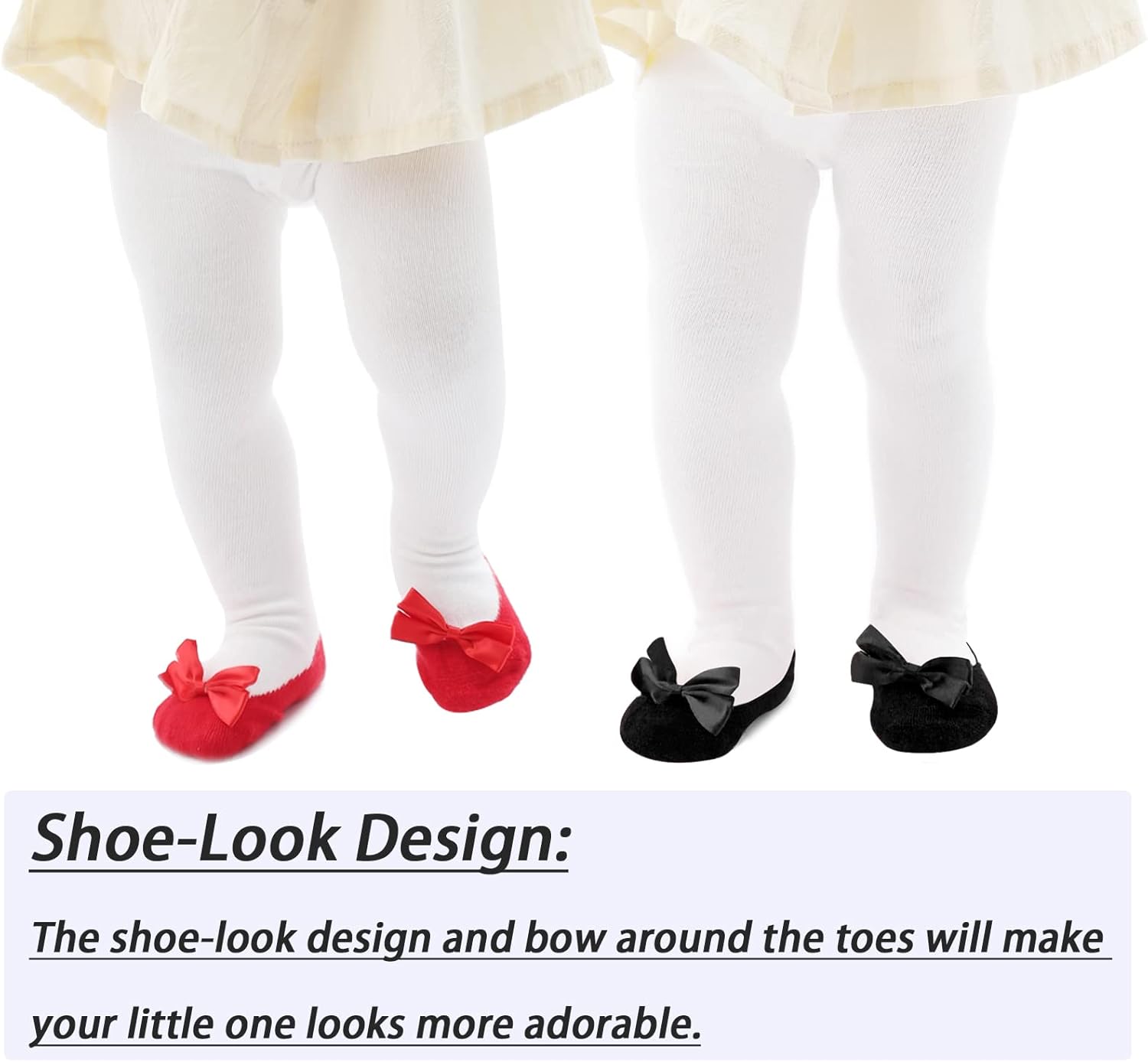 • Shoe-Look Design: The baby girl tights will make your little one looks more adorable with the shoe-look design and the bow around the toes. Also great for kids who hate shoes, you couldn't tell from the pictures that they were socks.