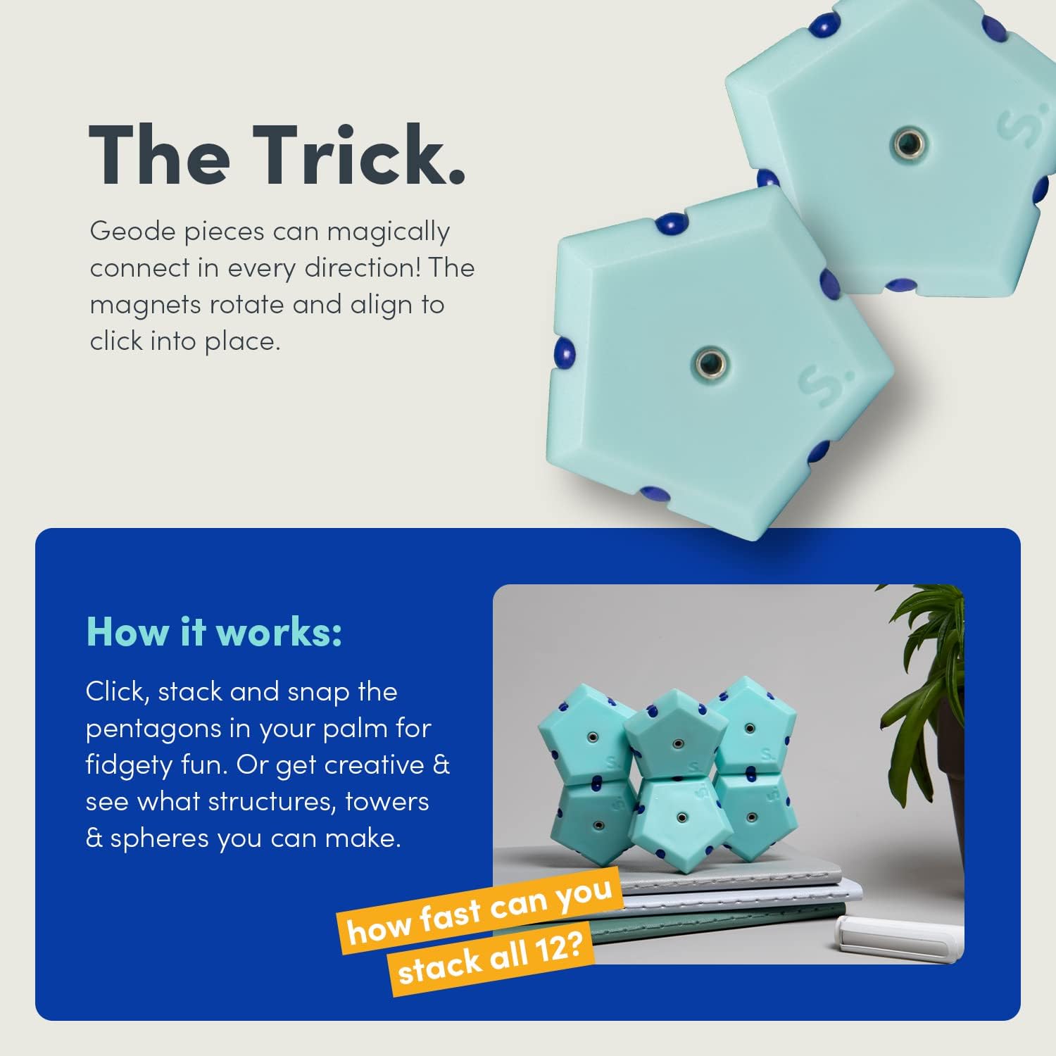 - FUN FRUSTRATION FREE FIDGET: Fidget to find your favorite configuration! Geode pieces connect on every side so you’ll always find a connection. Easy to use, harder to master - you’ll be playing with these pentagons permanently! Way more fidgeting fun than a fidget spinner, trust us!