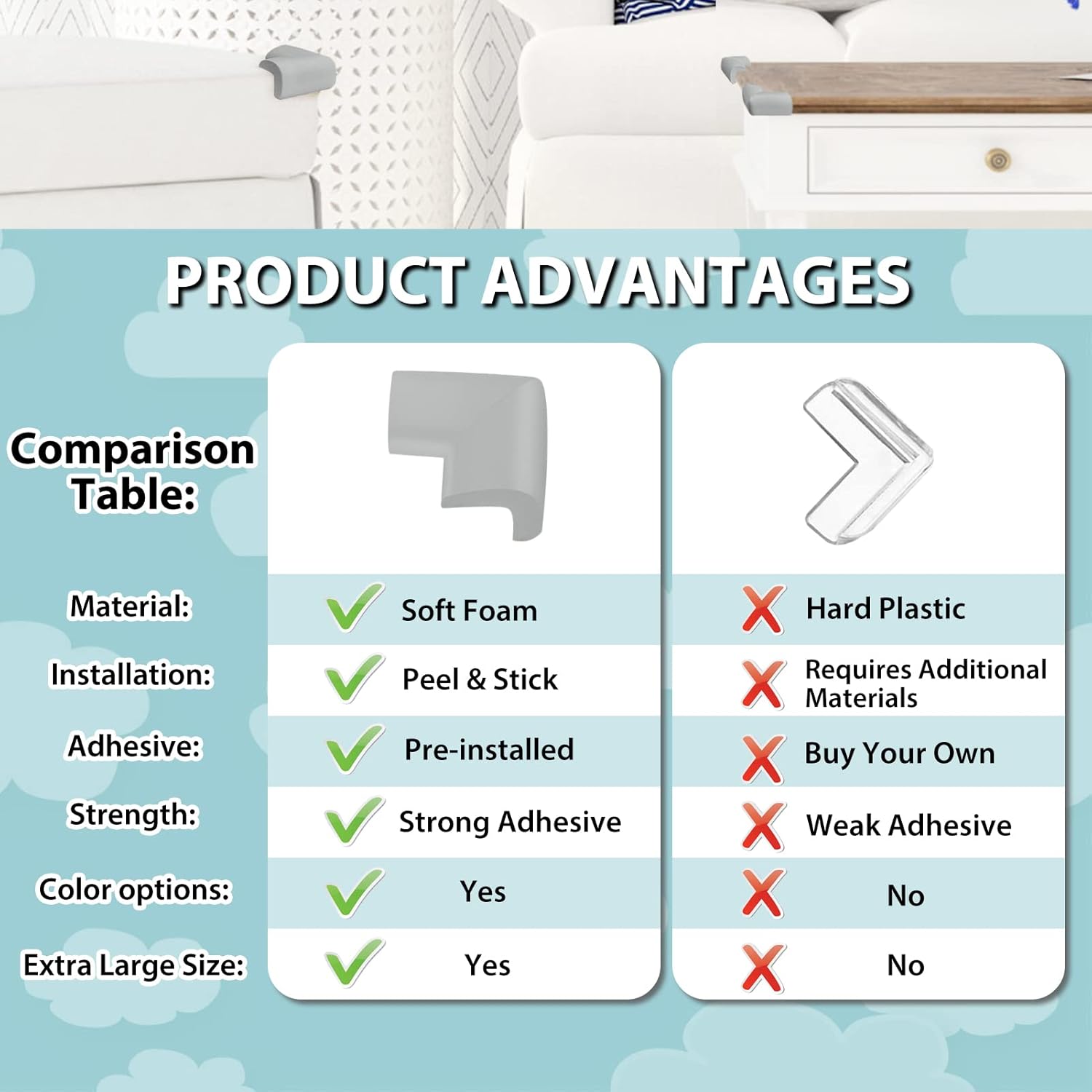 - Easy Installation: All of our baby proofing edge guards are pre-taped.You can just clean the corner of the furnitures, tear off the tape, align it with the corner, then stick the edge guards and press it gently. The whole process will take you no more than one minute.