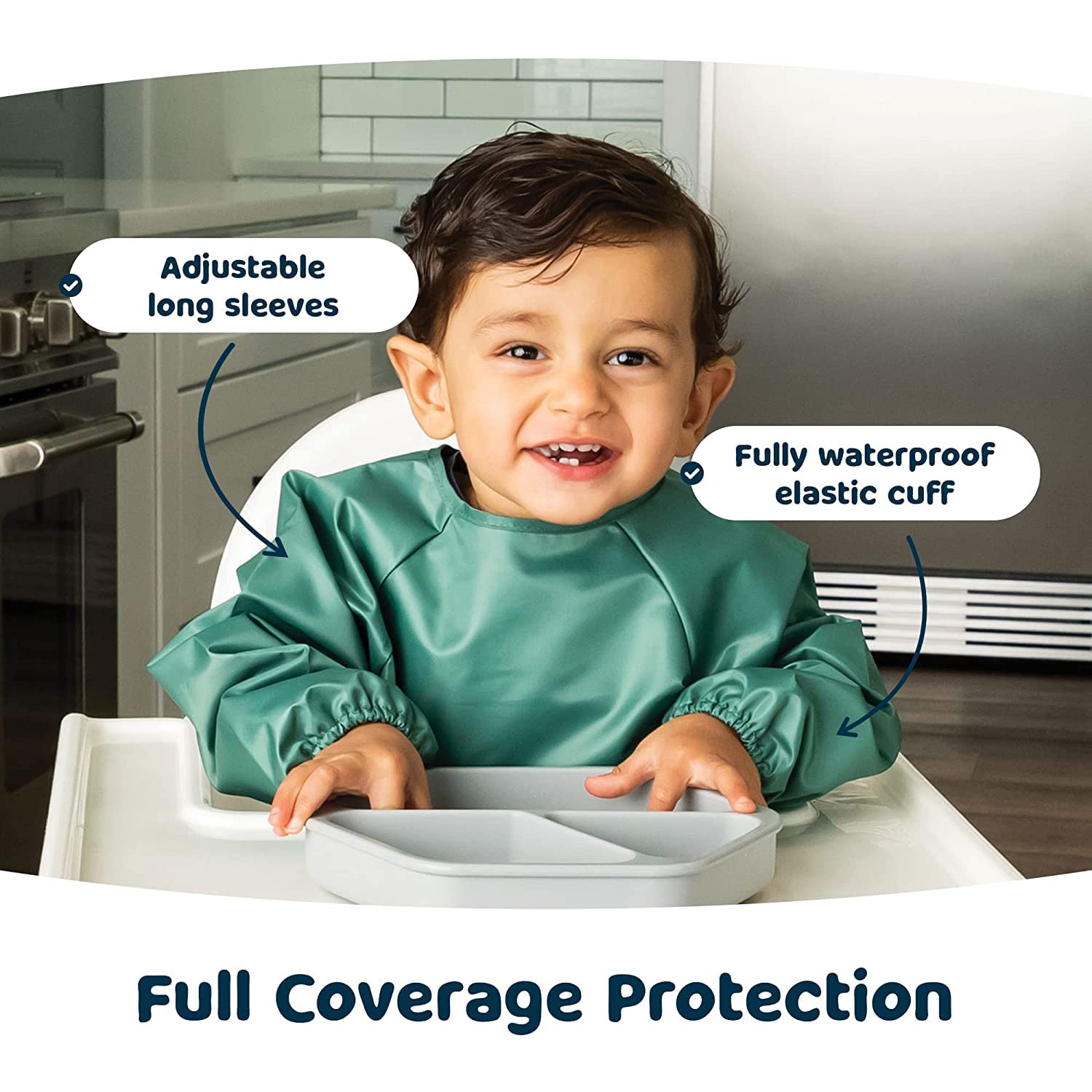 - EASY TO USE: Designed for baby-led weaning chaos, our waterproof baby bibs (6-24 months) feature a no-scratch closure that stays put during tugging but is also easy to remove. The 100% recycled polyester fabric wipes clean in seconds. New parents obsessed with baby feeding essentials love how these toddler-proof baby bibs transform messy high chair meals into stress-free bonding time. Perfect for baby bibs or toddler bibs.