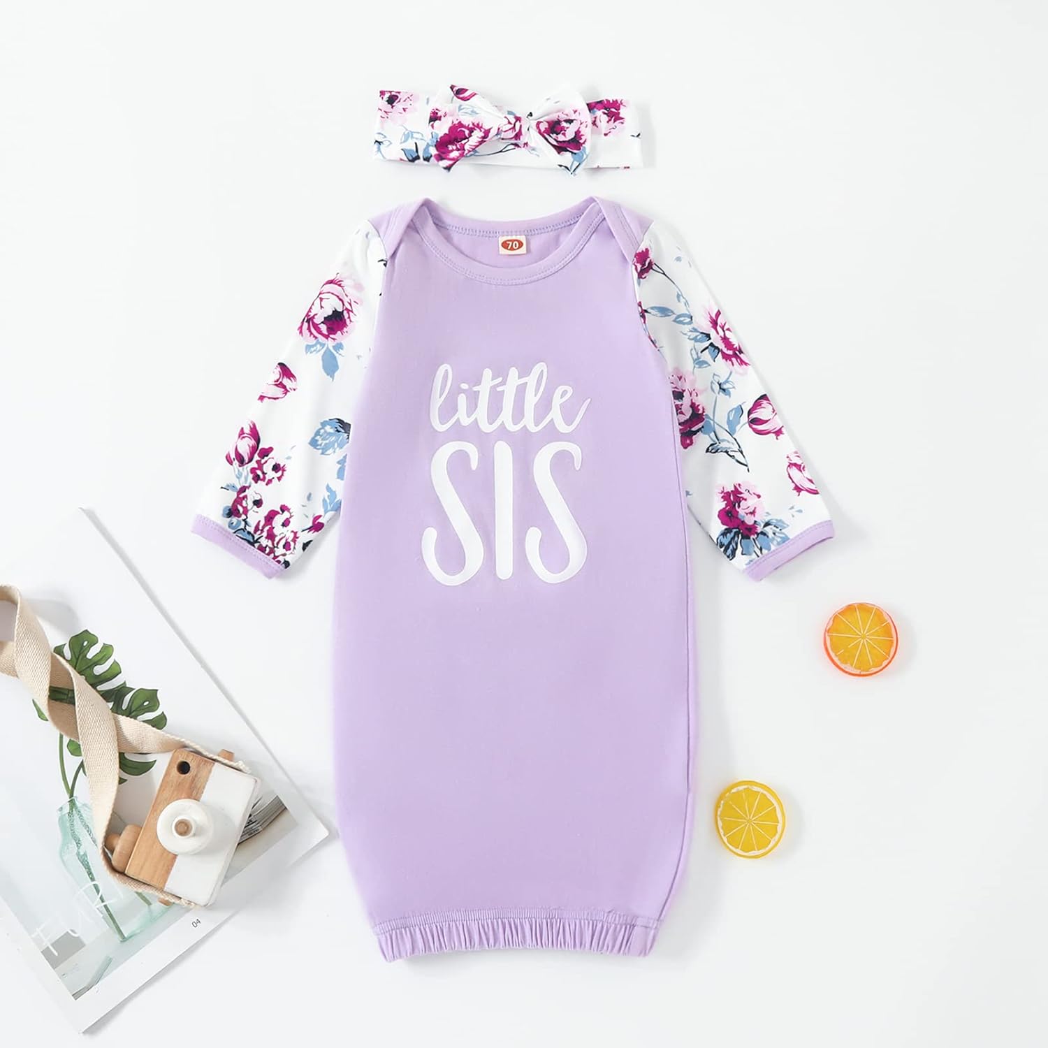 • Cute baby nightgown: "Little Sister" letter print, vintage floral long sleeve design, matching bowknot headband, super fashionable 2pcs baby sleep gown baby pajamas in spring summer fall winter.