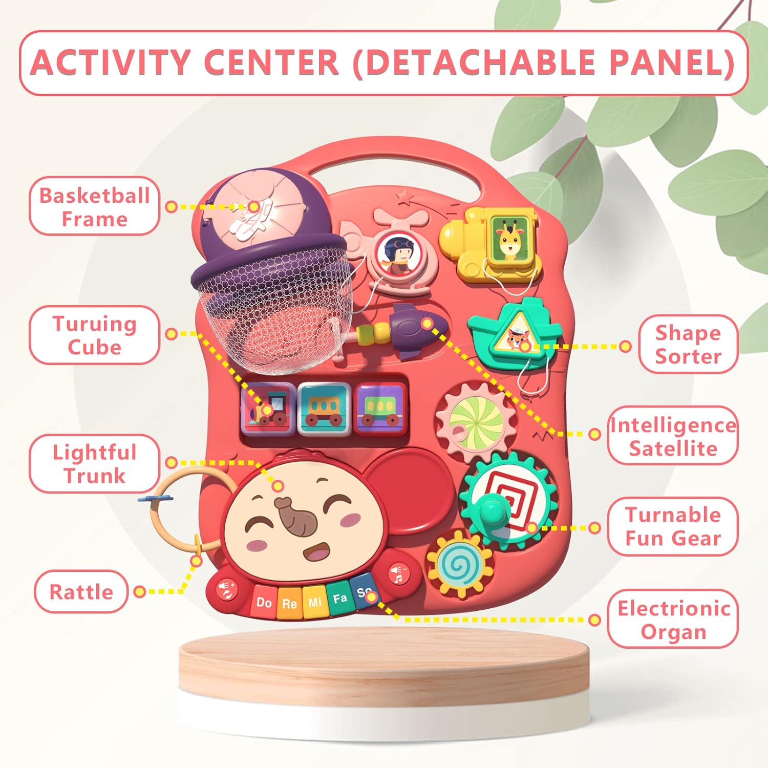 - Engaging Play Panel: Detachable table includes a basketball hoop (3 balls), shape sorter, spinning rollers, and a removable piano keyboard to spark creativity and teach colors, shapes, and rhythm.