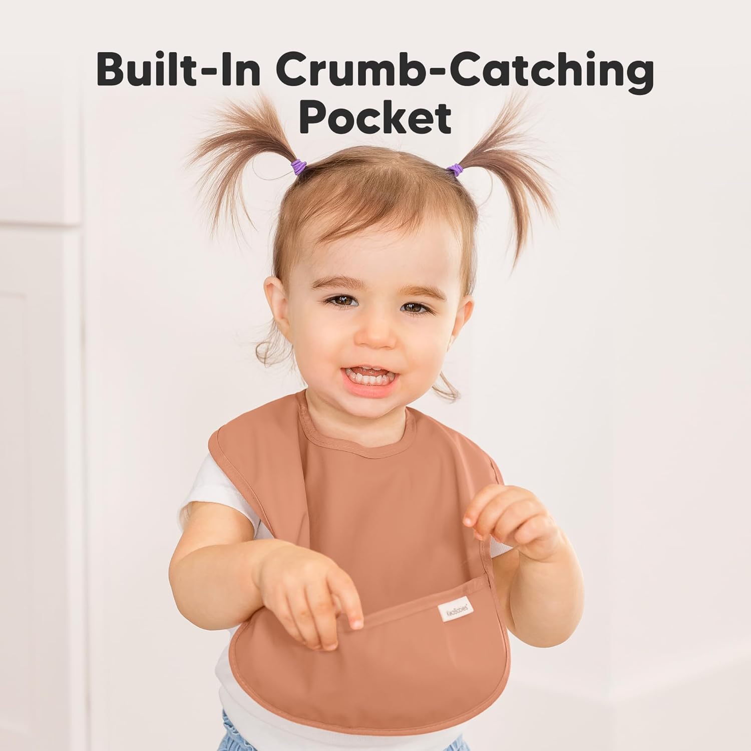 3-Pack Waterproof Baby Bibs for Eating - Lightweight Toddler Feeding Bibs with Large Food Catcher, Mess Proof, Food-Grade Baby Eating Essentials, Easy to Put On & Clean (Fawn)