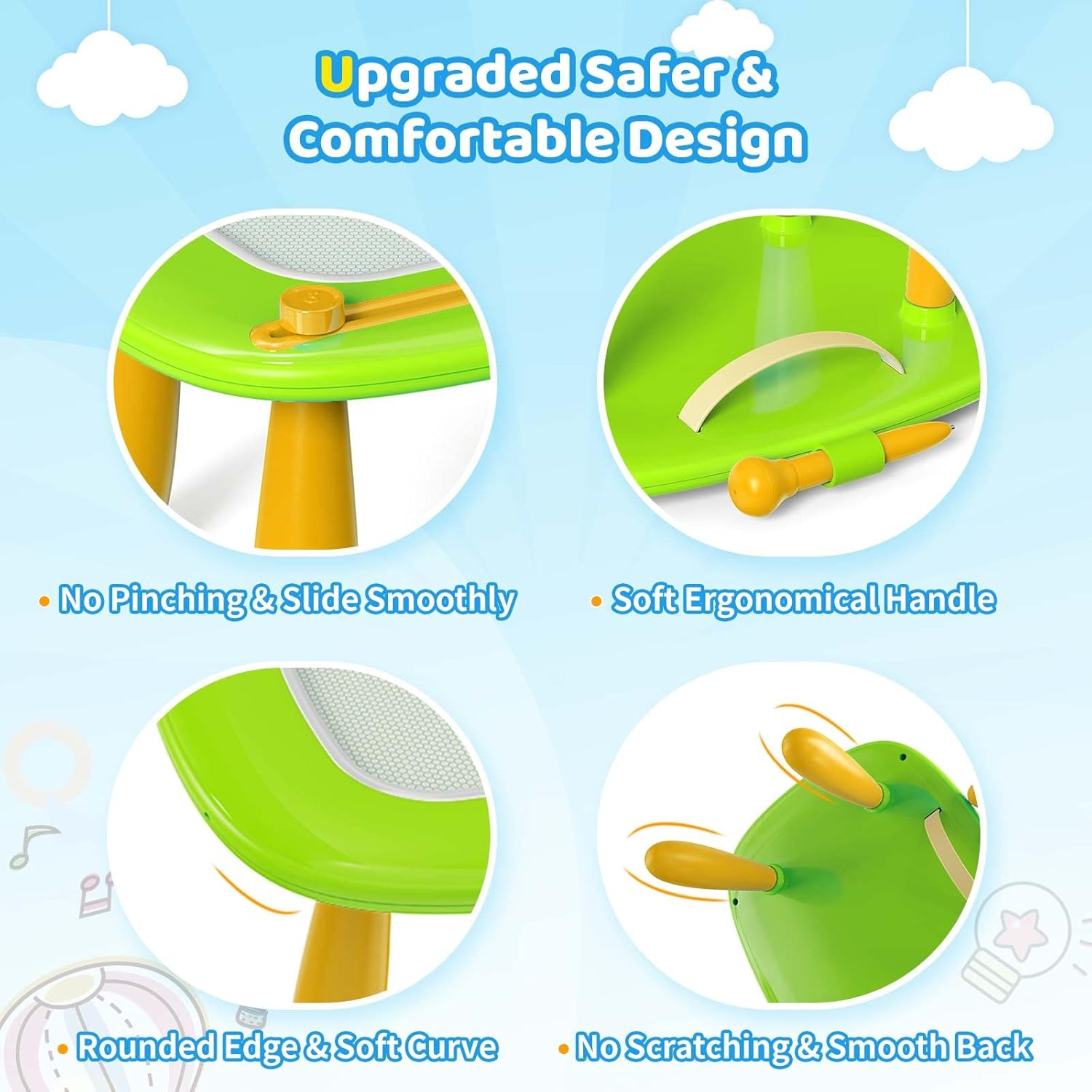 - Safety: Our magnetic drawing board is crafted with top-notch ABS material, ensuring both durability and quality. Safety is our utmost priority, which is why this board is non-toxic, BPA-free, and free from any small parts that could pose a choking hazard. We've taken extra precautions to make it child-friendly, with a Full-Sealed back and rounded corners to prevent any accidental scratches.