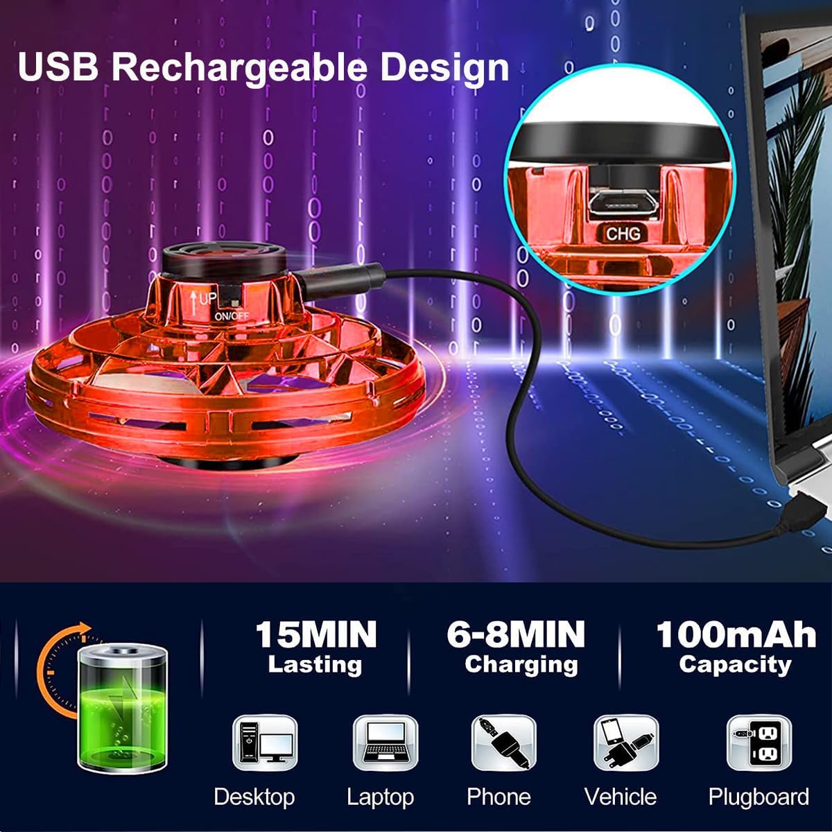- USB Charging & Portable - This UFO flying toy is fully charged in about 15 minutes. Work 8-10 minutes. Support multiple charging methods such as computer, adapter (please do not use quick charger), power bank, etc. When the LED indicator flashes, it means the aircraft needs to be charged. The light stays on during charging and turns off when charging is complete. This compact drone is easy to carry whether you put it in your pocket or hold it in your hand.