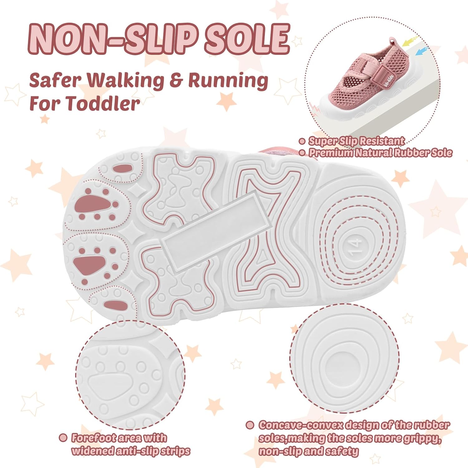 • Breathable Upper: The toddler walking shoes feature a breathable mesh upper that quickly absorbs sweat. Cut-outs enhance the breathability of the baby shoe, ensuring your baby stays fresh all day. Easy to clean and machine washable, making them convenient for busy parents.