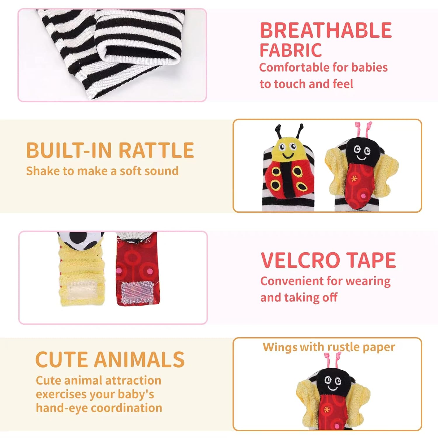 - Fun for Baby- All Wrist Rattles Attach with Simple Velcro, Easy to Put on and Off, Garden Bug Series, Colorful Sensory Design and a Smiling Cute Animals Bee, Butterfly, Ladybug and Spider Theme Entice Little Baby to Touch, Grab and Interaction and Exploration and Look at Them, A Good Toy to Focus Baby Attention, Research on the Development of Infant Science Led to the Invention of Foot Finder Socks and Wrist Rattles. Set includes: 4 Pieces: x2 Wrist Rattles Straps & x2 socks.