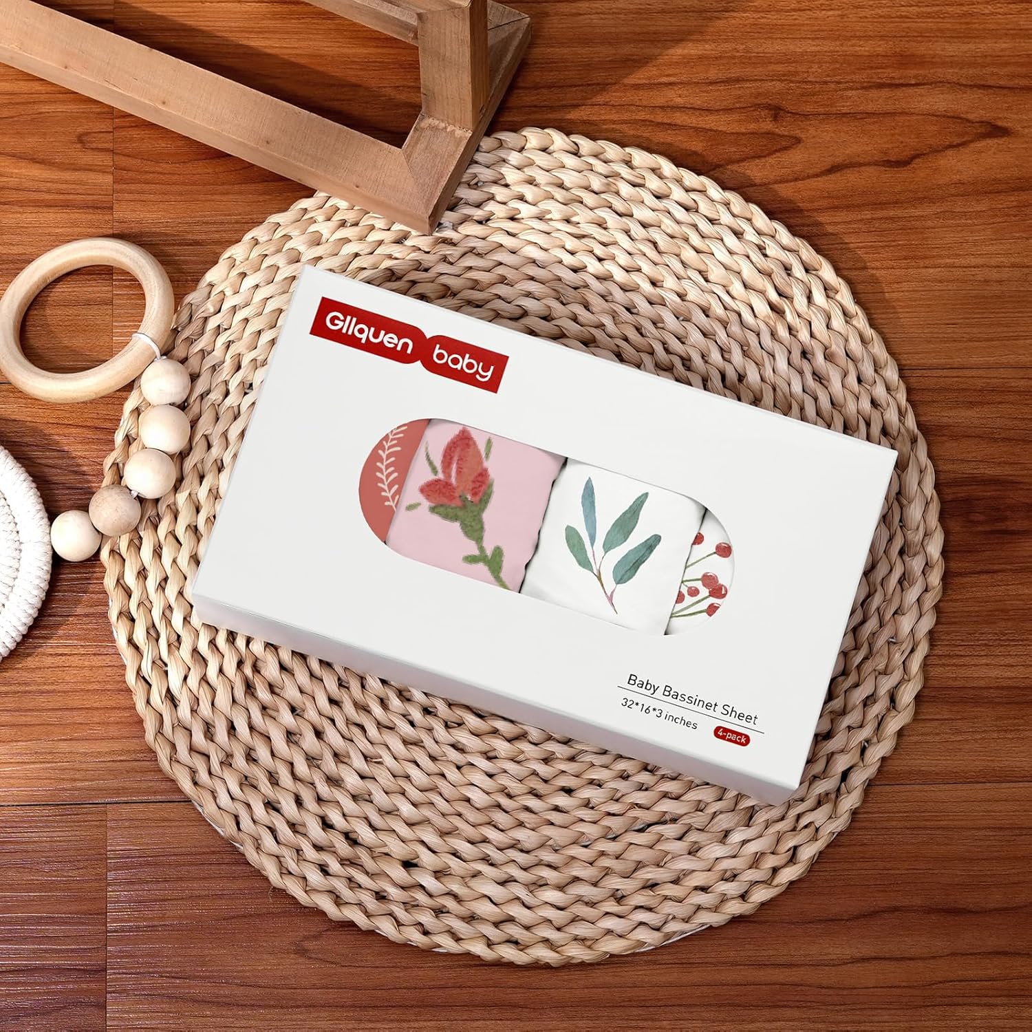 Gllquen Baby Bassinet Sheets 4 Pack, Breathable Cozy Fitted Mattress Sheet, Elastic Travel Crib Fashionable Floral Pattern, Standard Cradle Safe Sheets for Baby Boys Girls 32"x16" (Flower)