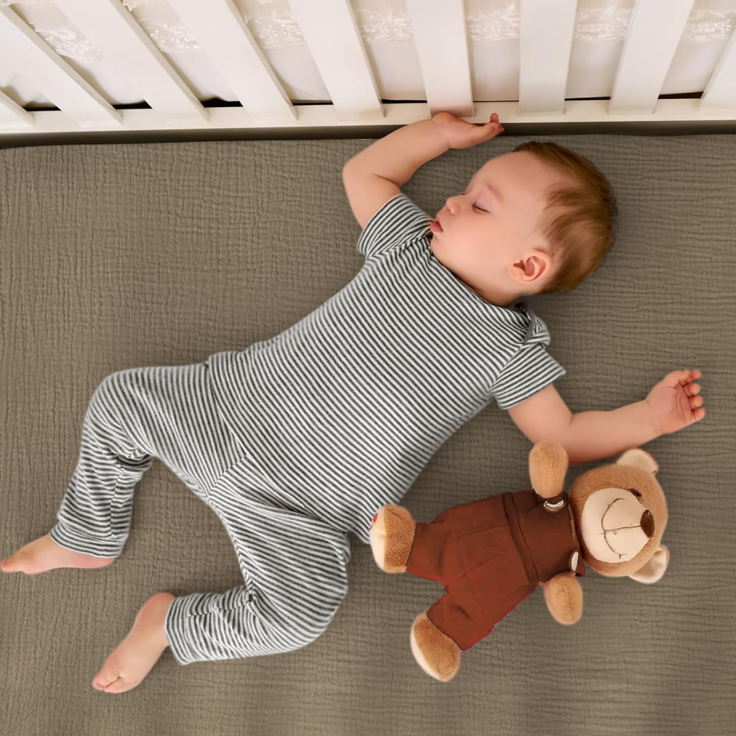 - Muslin Cotton: The muslin mini crib sheets are soft and breathable to give your baby a cozy place to sleep. They make a smoother transition from snuggled in your arms to safely sleeping in their mini crib.