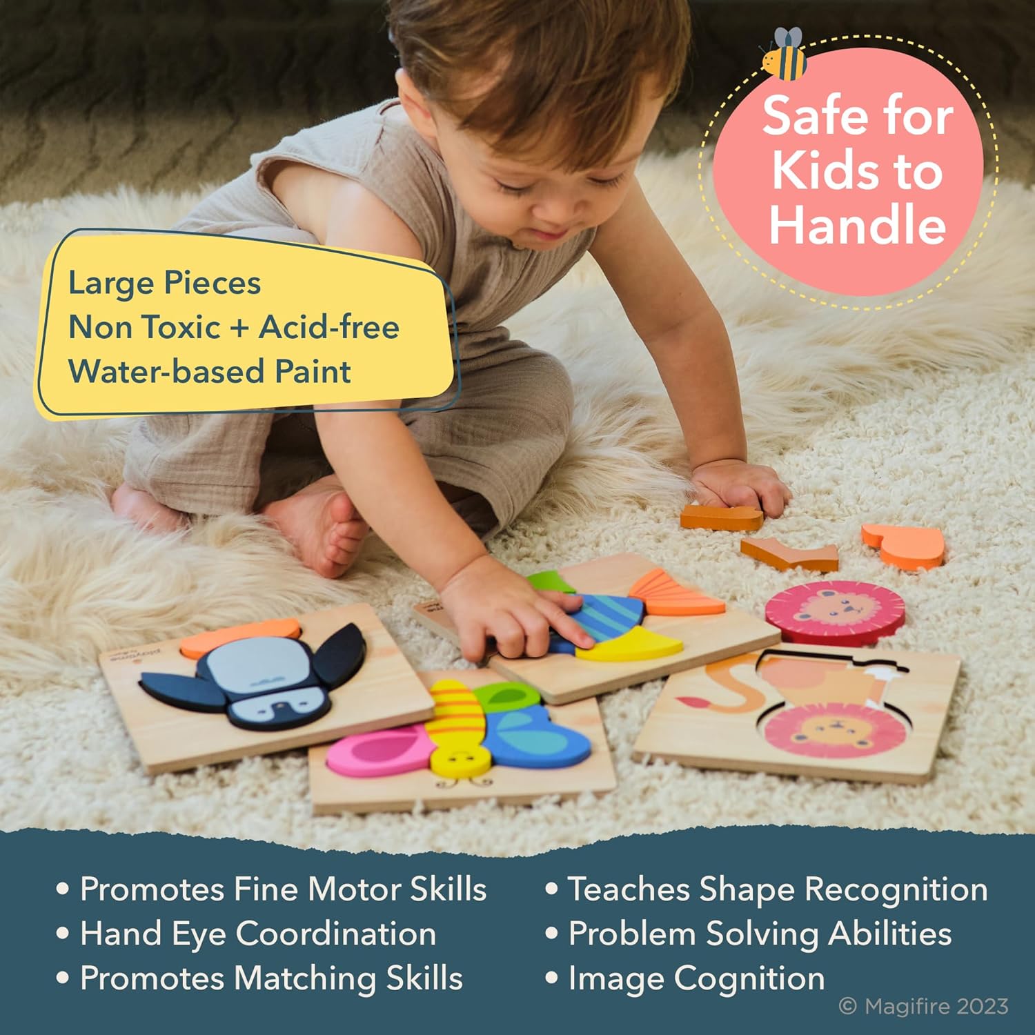 MAGIFIRE Toddler Puzzles Wooden Set of 4-4-Pack Multicolor Wood Animal Shapes with Storage Bag & Giftable Box - Wooden Puzzles for Toddlers 1-3 - Shape Recognition & Fine Motor Skills