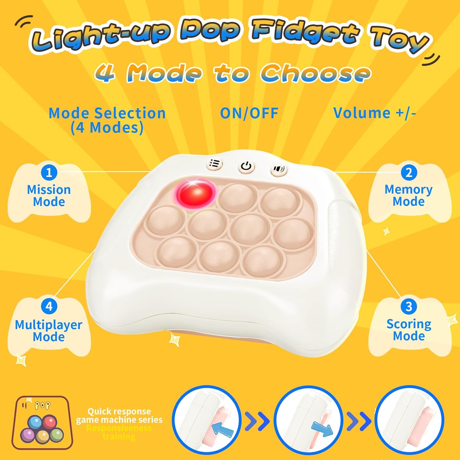 - 💡【Light-up Pop Fidget Toy】Classic pop game meets electronic handheld game! Our newly released quick push bubble game is more simple and funnier than other handheld games. It can promote your child's sensory development, and engage their positive thinking, hand-eye coordination, and brain training during playing.