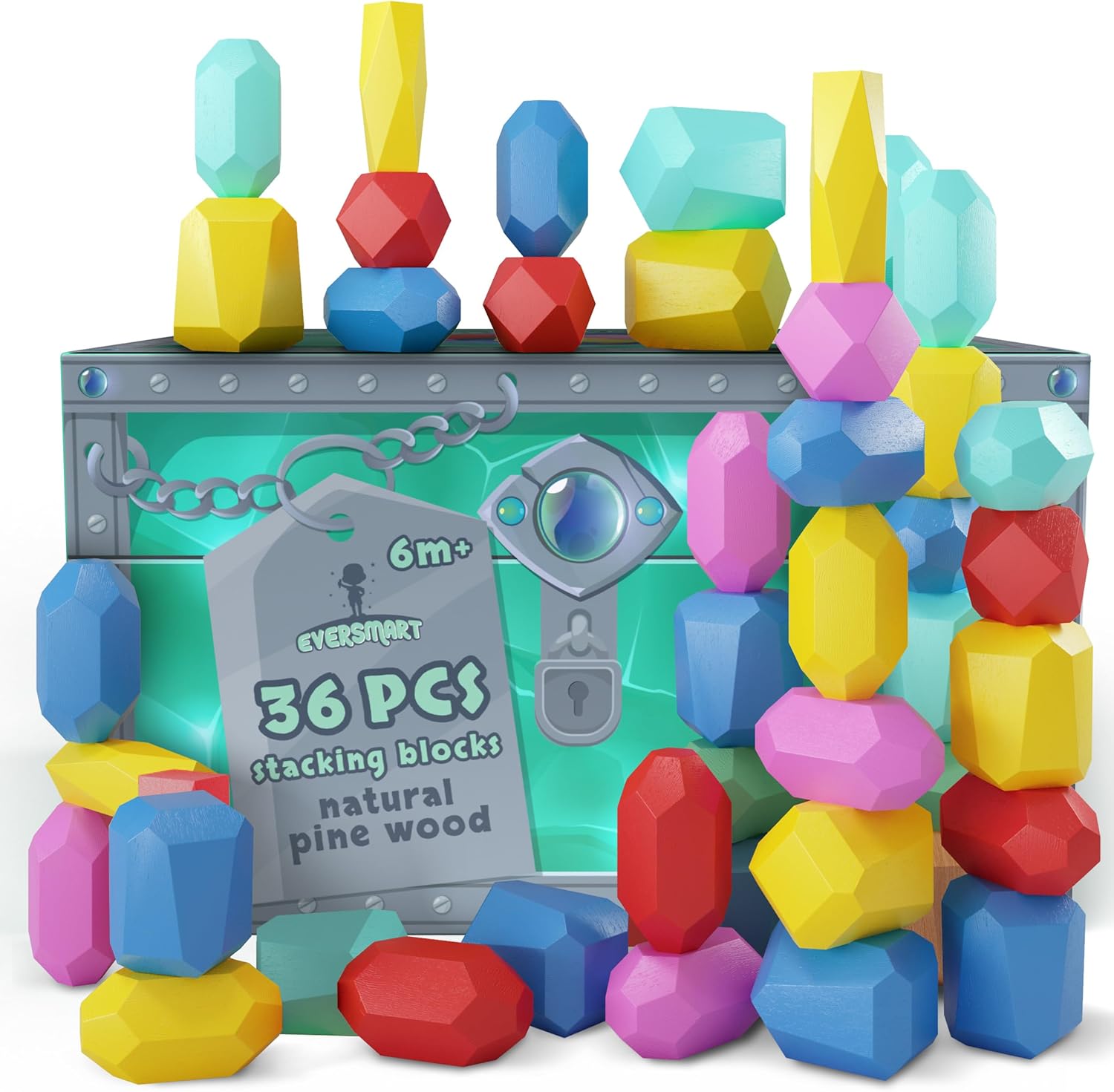 Wooden Stacking Blocks β Montessori Toys for 1 2 3 4 5 6 Year Old Toddlers and Kids, No Choking Hazard β Building Rocks Stones Games, for Girls and Boys