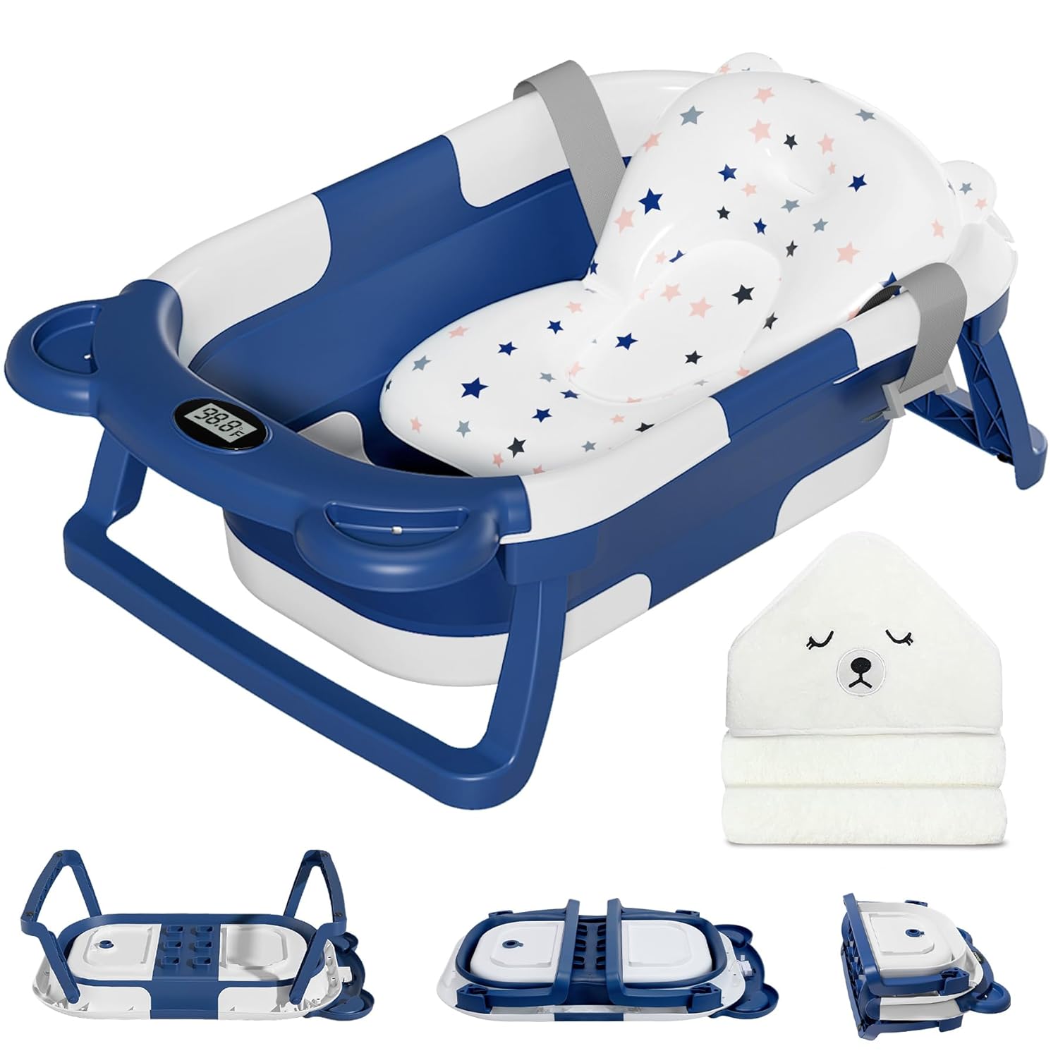 - 【Cute and Functional】The bear-themed collapsible baby bathtub, complete with thermometer, hooded towel, and soft floating cushion, was certainly eye-catching and added a fun touch to bath time.
