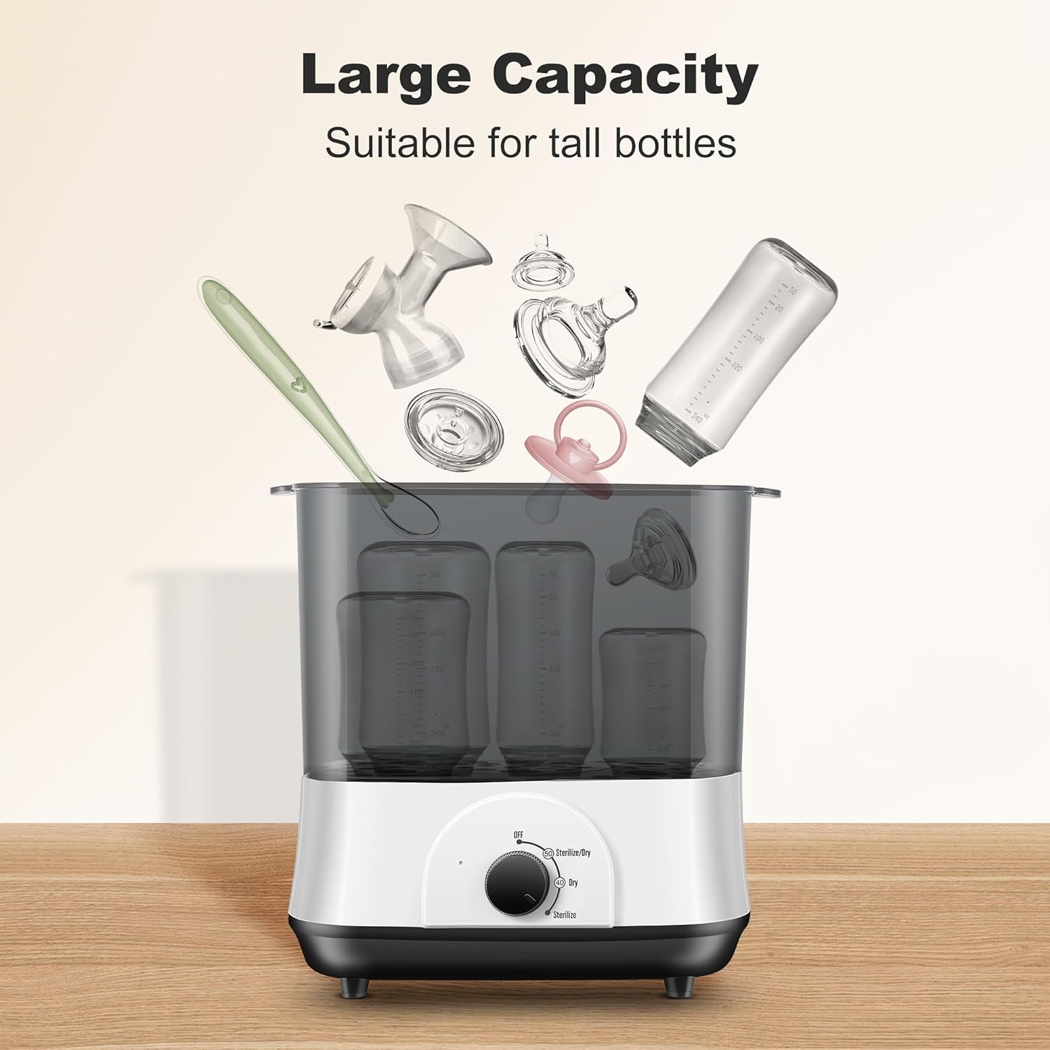 - 【Large Capacity】 Set-up the baby steamer and dryer with three different stacking options to clean up to 6 bottles and accessories like teethers, pacifiers, and plastic toys at once. It is designed to fit all bottles perfectly.