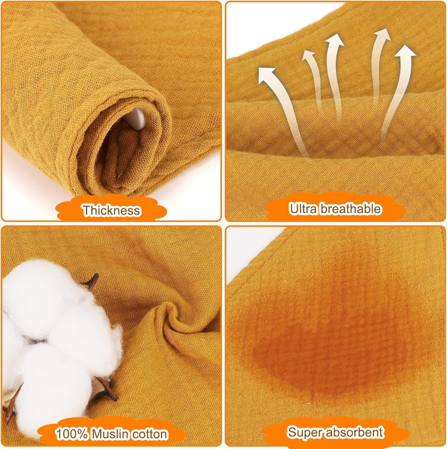 - Excellent Absorbent: These muslin bibs absorb liquid in seconds. It can soak up all drools and spits quickly. Perfect for protecting you and your baby’s clothing. keep baby's clothes clean and dry.