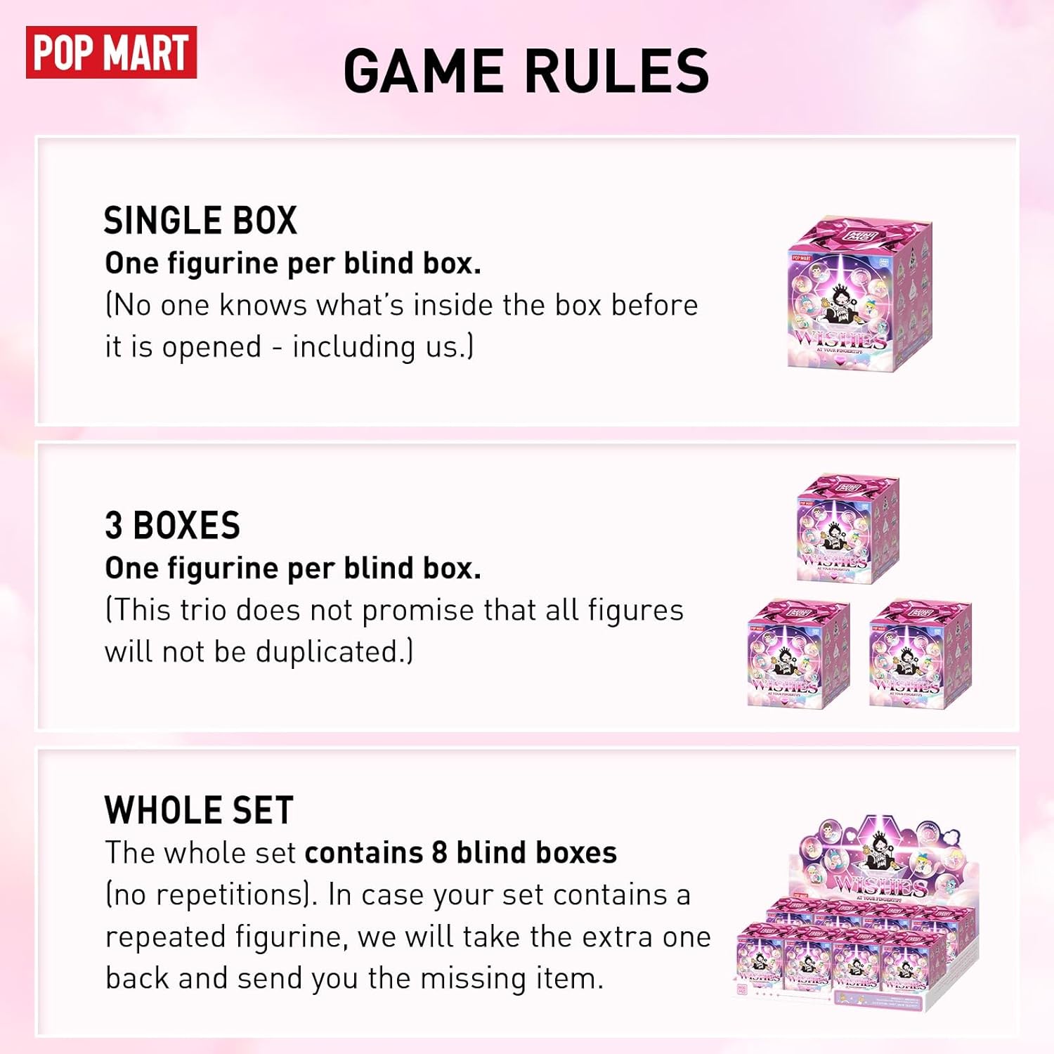 - POP MART Wishes at Your Fingertips Series Scene Set: Blind box toys are collectibles that come in a sealed box, with the content unknown to buyers until they open it. This collection contains 8 regular figures, and 1 hidden edition (Forever Love).
