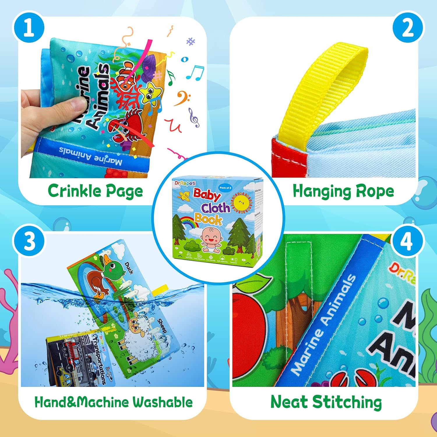 Dr.Rapeti Soft Cloth Books Baby Books Bath Books 8-Pack for Baby Infant Toddler Kid Crinkle Washable Chewable Early Educational Preschool Learning Giftable