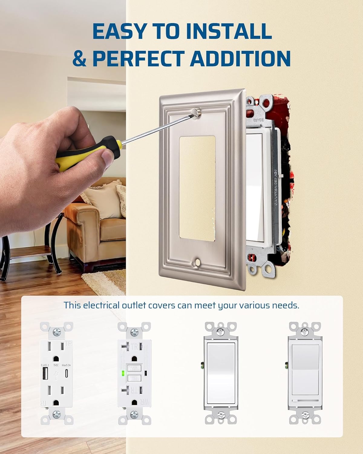 - [Classic Brushed Nickel Finish] Brushed nickel finish seamlessly blends into any decor style, great for living rooms, bedrooms, bathrooms, and kitchens; our light switch covers enhance your home's look and add a modern, upscale vibe
