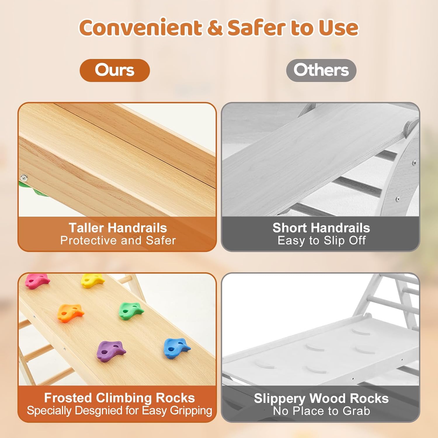 - 【Upgraded Safety Details, Ensure Safe Play】We pay attention to every safety detail. On the slide, we have increased the height of the protective handrails for safer sliding. The frosted climbing rocks have been specially designed to be easier to grip. To make the climbing poles work with the climbing set, specially designed half-moon grooves are provided to prevent sliding or falling off.
