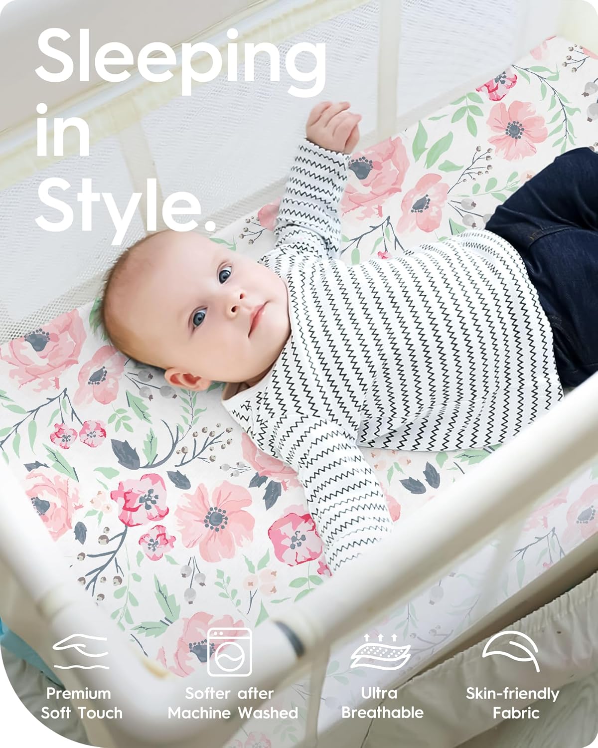 Pack N Play Sheets Girl, TotBasic Floral Mini Crib Sheets Fitted, Premium Jersey Knit Pack and Play Sheets, Stretchy Play Yard Sheets for Pack and Play Mattress, 2 Pack (Pink Floral)