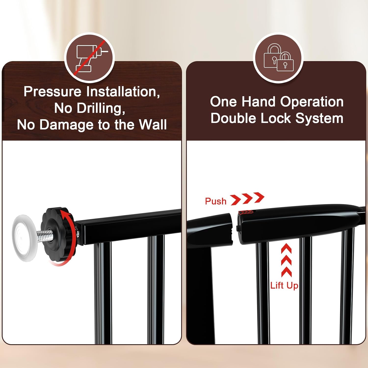 - 【Double Lock System】The baby gate walk through handle design makes it easy for parents to open,simply slide button, lift up the wide doorways baby dog pet safety gate to open the gate by adults with one hand. But it is tough for children. Ultra-secure, a double-locking option in the handle design to ensure the extra wide pressure mounted baby gate is securely installed for optimal security.