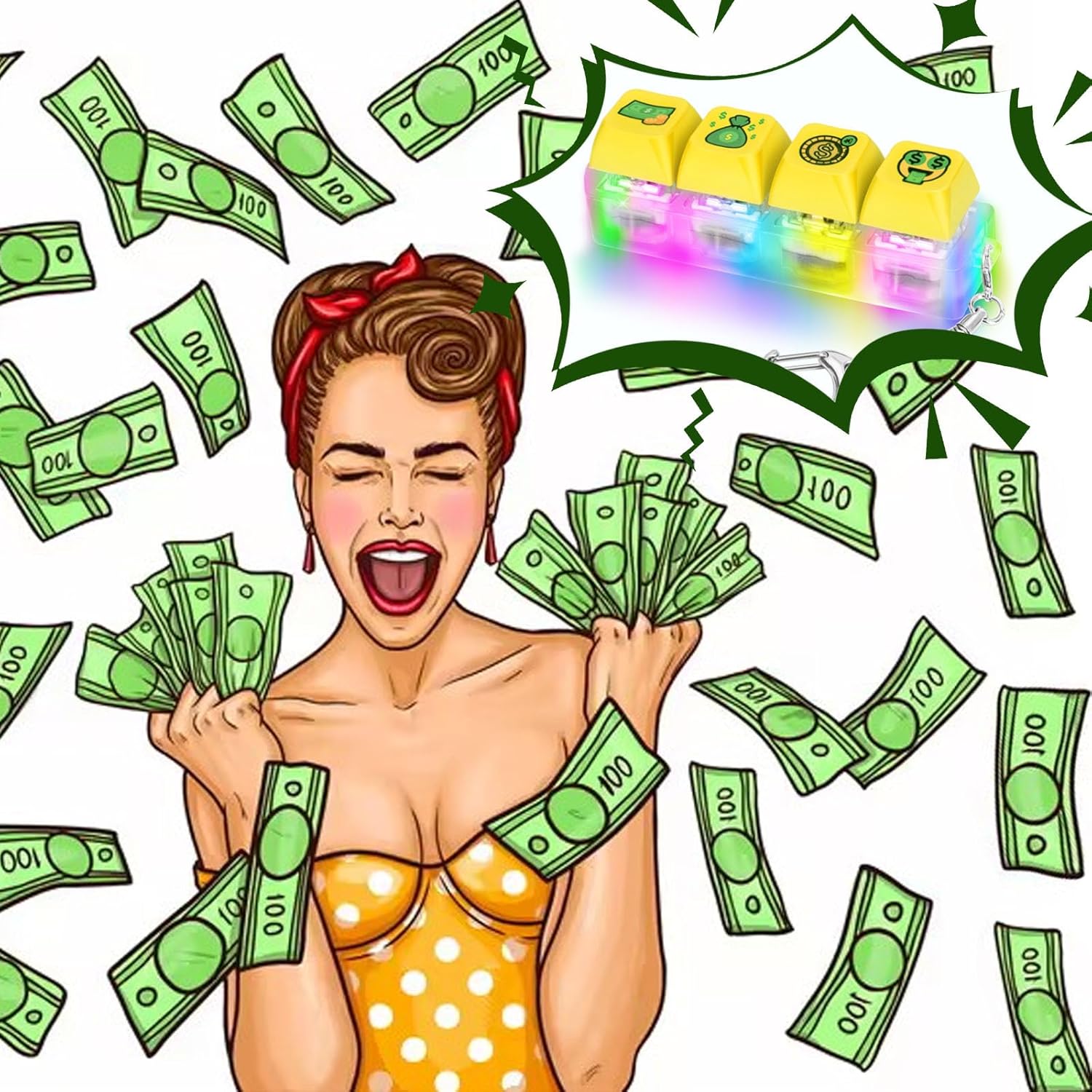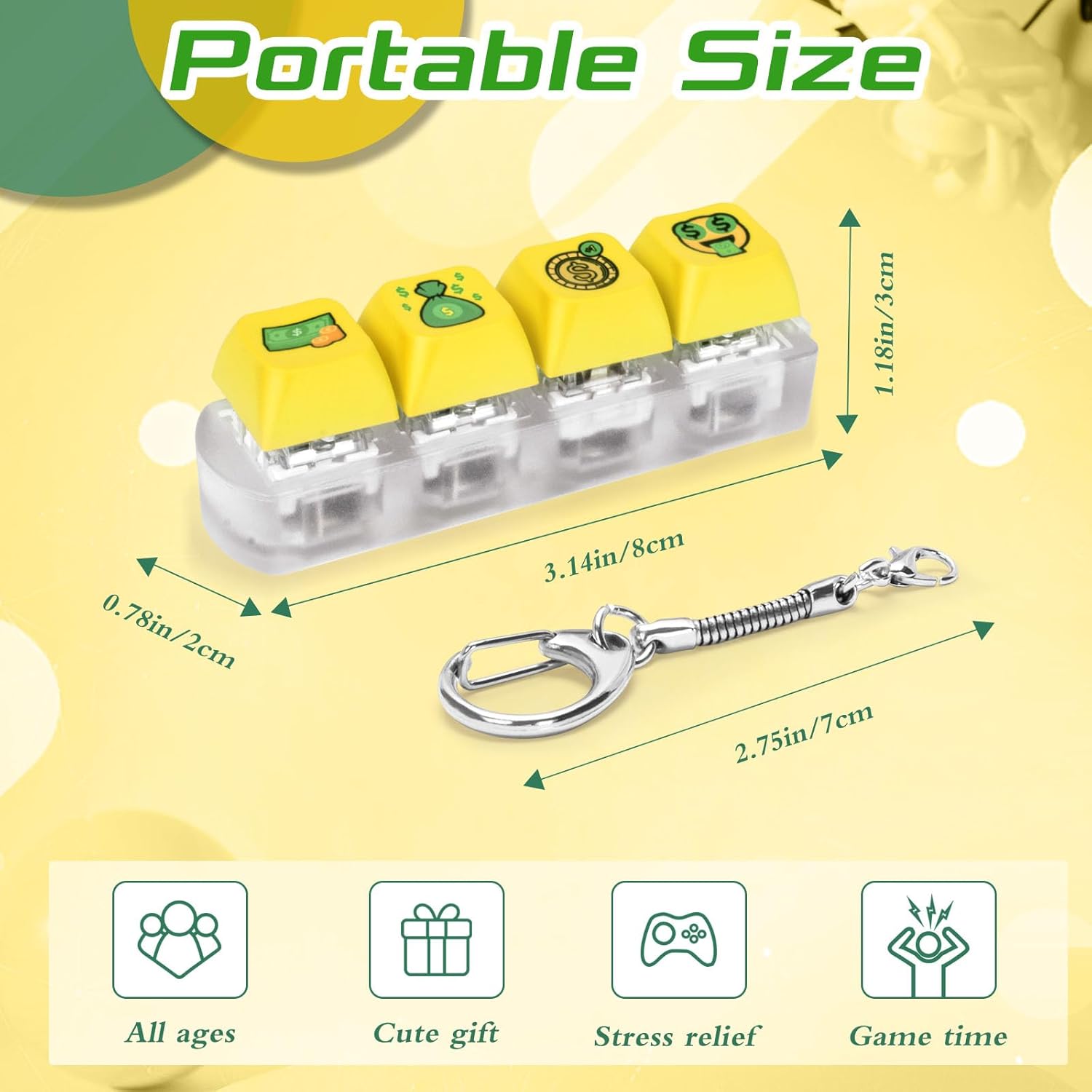 - 【Dollar Keyboard Fidget】The fidget keyboard toy consists of four keycaps, four internal cores with LED light and a transparent frosted base, and is a 4-in-1 keyboard fidget with a keychain. The color of the 4-in-1 mechanical keycap fidget is is styled with a dollar design and it is a creative fidget. Click on the dollar button of your small fidget and it will sparkle with colorful LED lights. Clicking on dollar keyboard makes you wealthier.