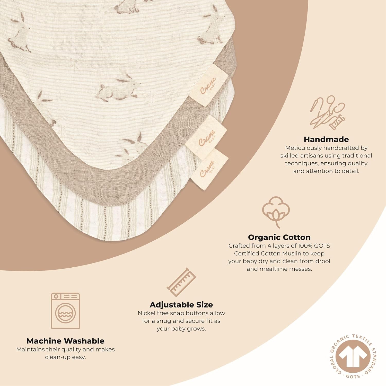 Crane Baby 100% Organic Cotton Baby Bibs, 3-pc. Set, Bunny Pattern For Boys, Girls, Unisex, Feeding, Drooling, Teething Bibs