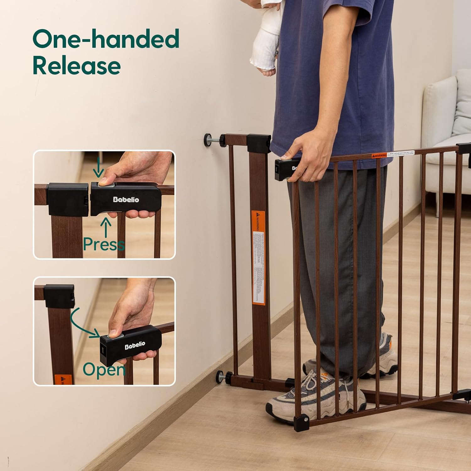 BABELIO 29-40" Metal Baby Gate with Black Wood Pattern, Auto Close Dog Door for The House、Stairs and Doorways, Pressure Mounted Pet Barrier, with Wall Protectors and Extenders