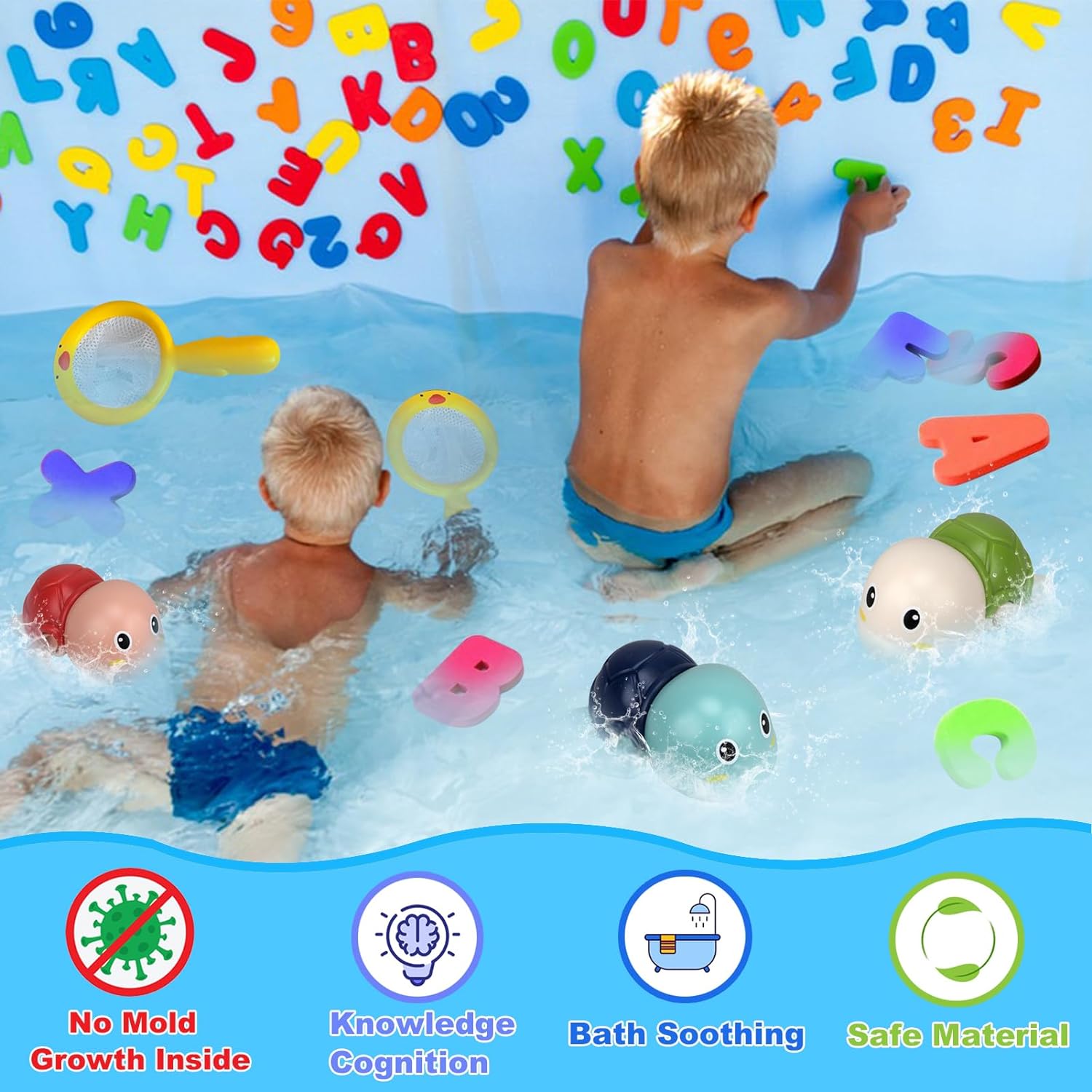 - SAFE BATH TOYS SET: This luxury baby bath toy set contains 26*Bath Letters(A-Z) & 10*Numbers(0-9) + 1*fishing net + 3*Wind-up Toys + 1*Mesh Organizer+ 2*Ultra Strong Hooks+2* Suction cup. with cute design and bright colors.The bath letters and numbers are made of soft, non-toxic foam, while the turtle toy is crafted from non-toxic ABS plastic. They are very safe to children.