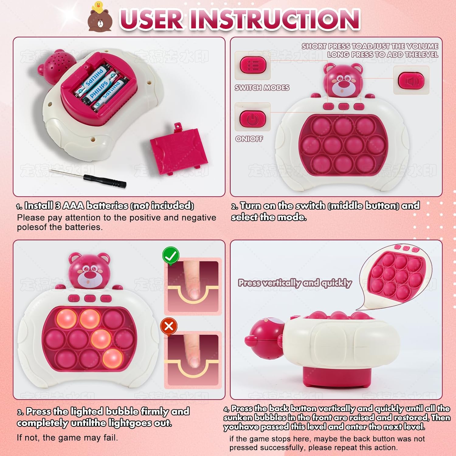 - đăEasy To PlayăPop all the lit bubbles as soon as they appear, and then press the big button on the back to reset the bubbles before time runs out! Keep popping the bubbles fast to level up. It is a perfect gift for boys and girls to developing fine motor skills, cognitive abilities, and sensory processing skills, making it an ideal educational toy for kids.