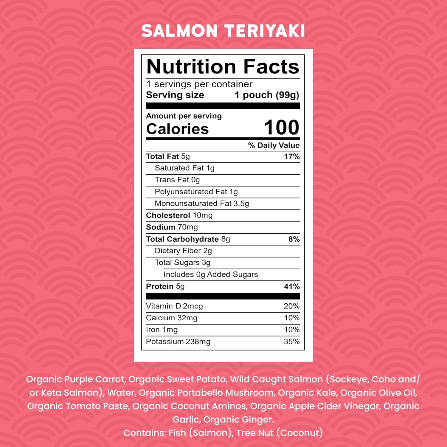 - THOUGHTFULLY CRAFTED: The Serenity Kids pouches salmon teriyaki pack is designed to mimic the nutrition of breast milk, using ethically sourced salmon and organic veggies. This baby food with meat puree is free of artificial additives and preservatives. Ideal baby meat pouches for your little one