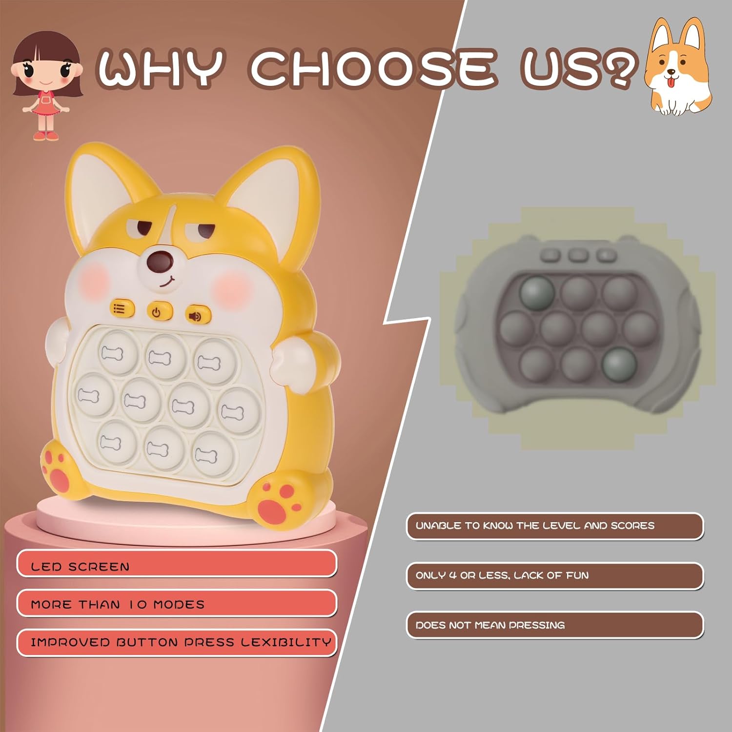 Fast Push Game Pop Fidget Toys for Kids, Fast Push Bubble Game, Quick Push Pop Game for Boys & Girls Age 3-12, Handheld Puzzle Game Sensory Toys Relaxation and Decompression (Yellow Corgi)