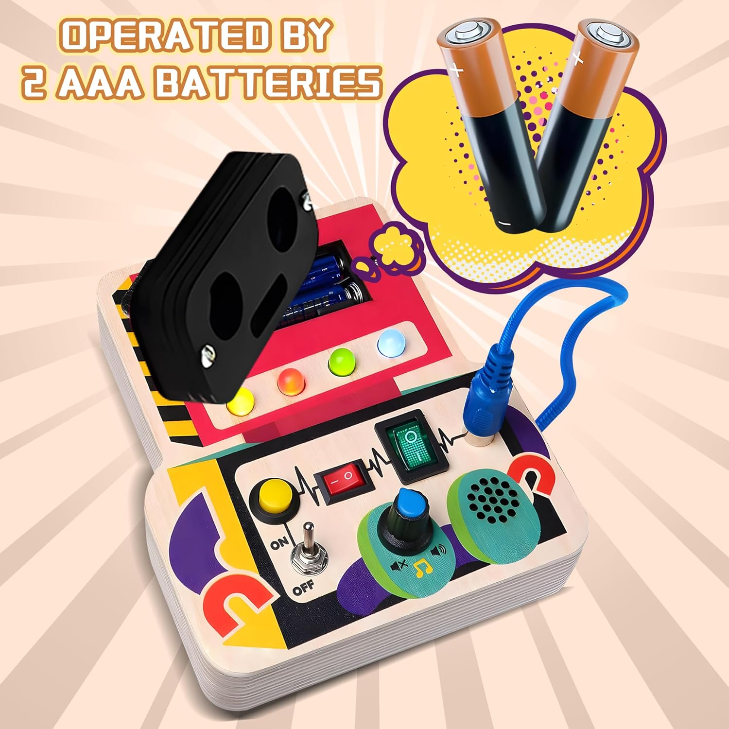 - 🌲 Wooden Material: Crafted from high-quality, non-toxic wood with smooth edges, this toddler busy board is free of small parts and certified for child safety. Featuring interactive switches, lights, music, and knobs, it supports hands-on sensory play while protecting your child’s eyes with gentle lighting. Requires 2 AA batteries (not included).